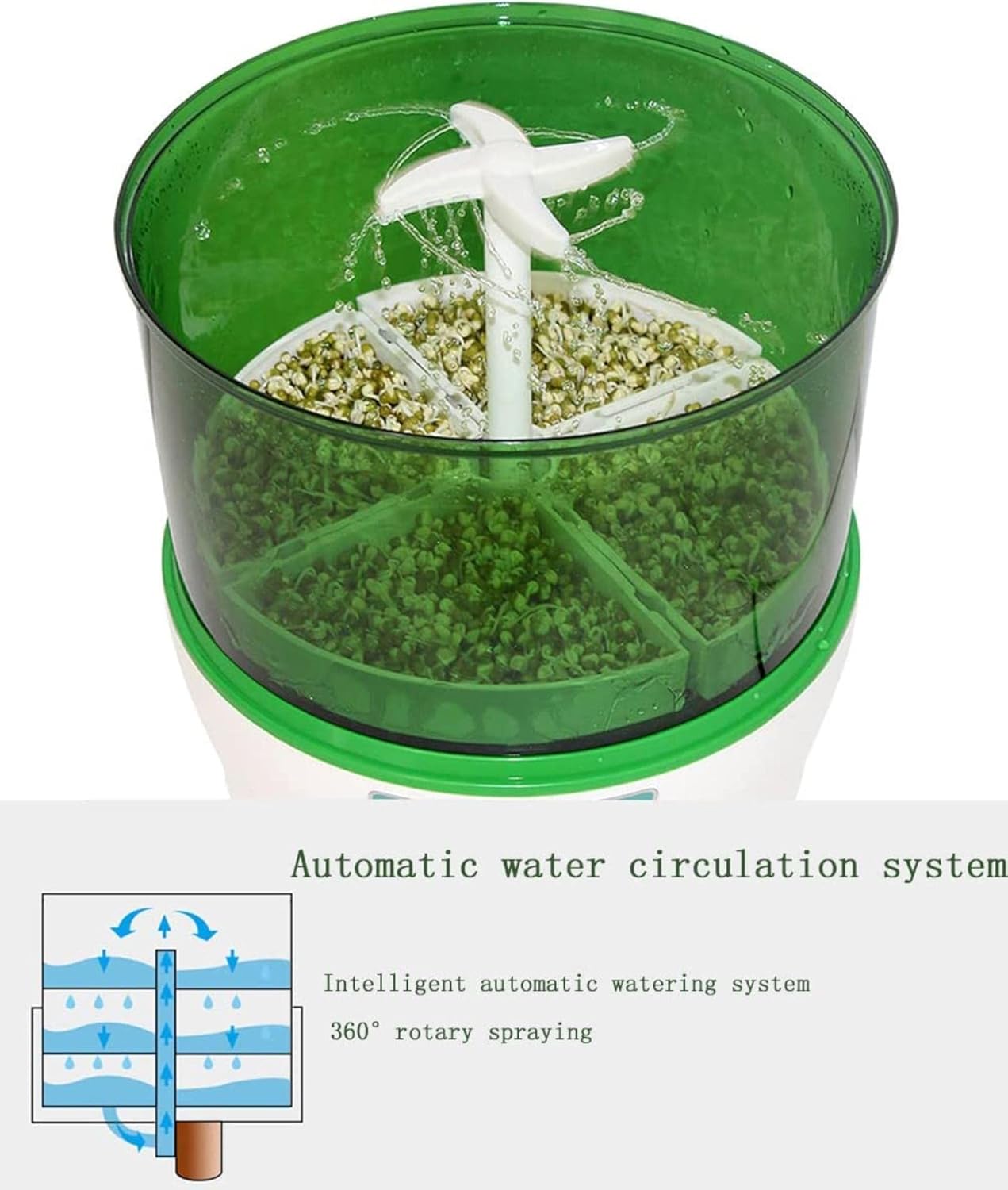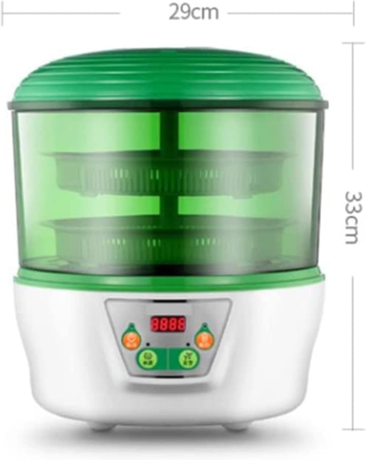 SpecificationSize: 29 * 33cm (11.4 * 12.9IN)Material: pp + ABSConstant temperature: 20wColor: GreenGermination Time: 2-2.5 daysMaking Yogurt Time: 8-12 hoursBrewing rice wine time: 28-38 hoursPacking specification: bean sprouts * 2PCSFeatures:Microcomputer accurate control stressMulti-function (bean sprouts, sterilization, yogurt, rice wine)Automated beans functionAutomatic water circulationBecause everyone's display is different, there may be little color difference, please understand ~It is recommended that any transgenic soy is not planted, which can only be used for edible.Most yellow soy is a transgenic.Therefore, green peas is recommended.If you have any problems, please feel free to contact us.We will provide you with the best services.