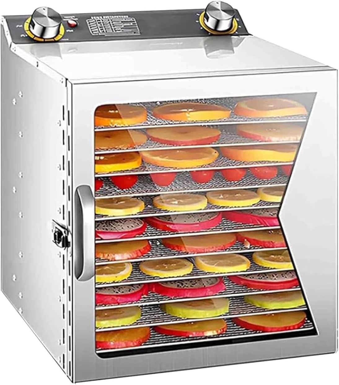The home freeze dryer machine is designed with advanced air circulation technology, ensuring efficient food dehydration while preserving essential nutrients. This versatile food dehydrator can handle a variety of ingredients, such as fruits, vegetables, meats, and even flowers, making it an ideal addition to your kitchen for healthy snacking or meal prep. Specifications: - Product Name: Food Dehydrator/Freeze Dryer - Material: 304 Stainless Steel and Tempered Glass - Rated Power: - 8 Layers: 400W - 12/18 Layers: 800W - Rated Voltage: 220V~50Hz - Time Setting Range: 1-12 hours - Temperature Setting Range: 30-90°C - Tray Size: 28.5x20 cm - Distance Between Trays: 2.5 cm (1 inch) - Dimensions (without handle): - 8 Layers: 30x30.5x28 cm (11.8x12x11 inches) - 12 Layers: 30x30.5x38 cm (11.8x12x15 inches) - 18 Layers: 30x30.5x53 cm (11.8x12x20.9 inches) - Weight: 5 kg / 7 kg / 9 kg Features: 1. 360° Uniform Drying: Locks in the freshness and flavor of your ingredients. 2. Transparent Tempered Glass Door: Allows you to easily monitor the drying process without opening the machine. 3. Built-in Timer and Temperature Control: Set the drying time and temperature between 30-90°C for precise dehydration. 4. Cooling Holes: Prevent overheating, ensuring safe operation. 5. Removable Mesh Tray: Simplifies the cleaning process, making maintenance easy. 6. Versatile Food Drying: Efficiently freeze-dries a variety of foods, retaining optimal flavor and nutrition for all your culinary needs. Package Includes: - 1 x Food Dehydrator Transform your food preservation routine with our home freeze dryer, perfect for creating healthy snacks or meal prepping for your family. Enjoy the benefits of long-lasting, flavorful foods while maintaining their nutritional value.