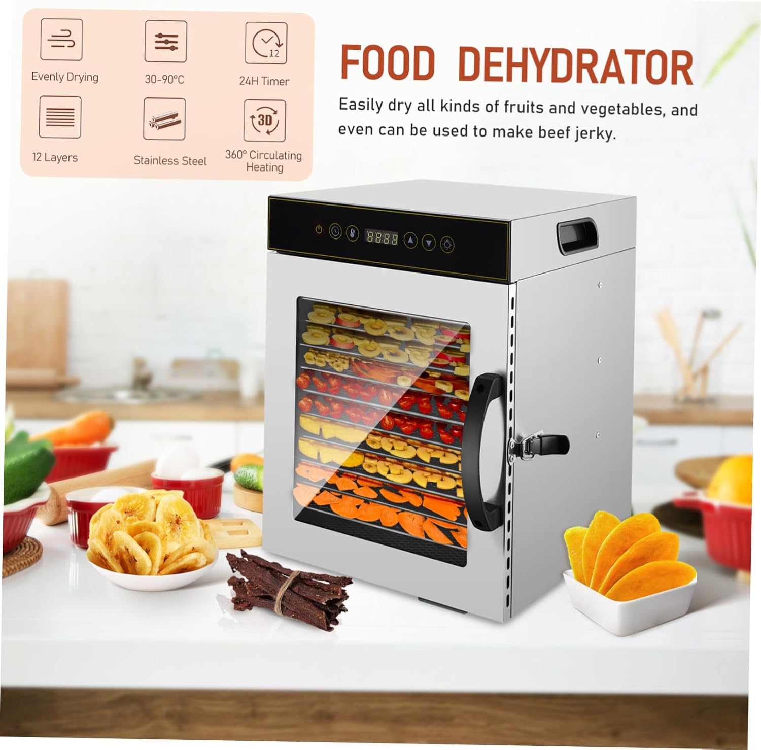 Package List 1 x food dehydrator Features -Versatility: nice for a range of applications, this dehydrator is excellent for preparing healthy snacks, seasonings, and more kitchen accessories -Temperature range: 30~90°℃ (86~194℉) small household multifunctional food dryer -Color:Silver food dehydrator commercial -Design: The thoughtfully designed control panel makes it easy for anyone to operate, ensuring consistent drying results every time stainless steel salad dehydrator -Power: 700W fruit dryer dehydrator -Capacity: With twelve layers available, you can dry large quantities of produce, an essential tool for meal planning and preservation multifunctional food air dryer -Size:39.00X31.00X30.00cm/15.33X12.18X11.79in commercial dehydrator -Tray size: 28.3x20cm home dried fruit machine -Material:Stainless steel food air dryer -Timing range: 30 minutes~ hours food dryer machine for home -Number of product layers: 12 layers fruit and vegetable dryer -Product Info:Food DryerGoods Informationfood dehydrator Note: This item comes with US plug, please confirm the voltage of your area before purchasing This multifunctional food dehydrator is designed to efficiently dry a variety of foods, including meat, seafood, fruits, and vegetables.vegetable dehydrators Nice for home or commercial kitchens, it simplifies food preservation.fruit and vegetable dryer Its sleek stainless steel construction makes sure durability and easy cleaning, while the layered design maximizes drying capacity