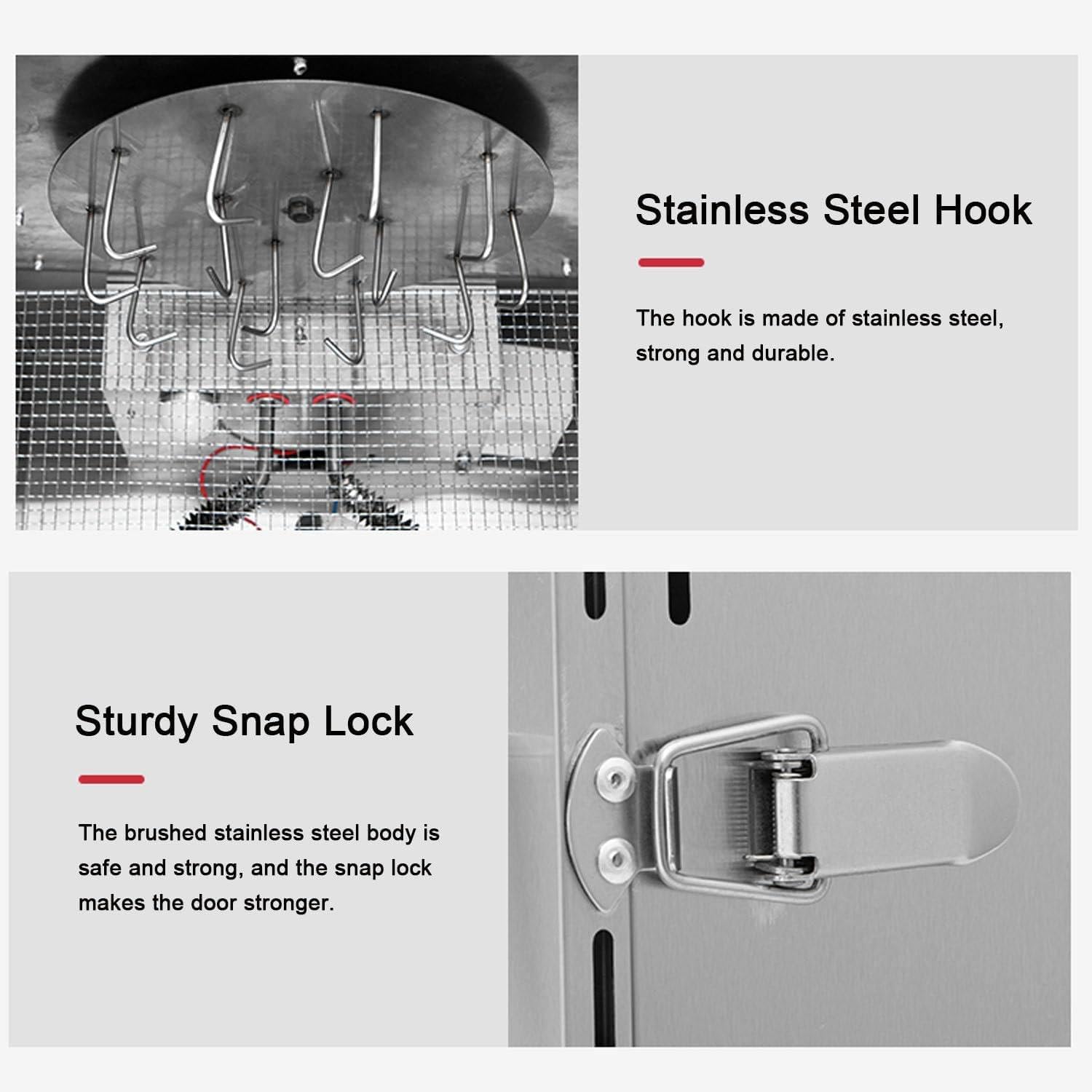 Introducing our stainless steel meat curing chamber, a professional-grade meat dryer designed for culinary enthusiasts and chefs. This versatile appliance is perfect for drying sausages, bacon, chicken, duck, fish, and beef, allowing you to explore a wide range of delicious homemade dried goods. **Key Features:** - **Extended Shelf Life:** Enjoy the rich flavors of your favorite dried meats while preserving their freshness and extending their shelf life, making it a valuable addition to your kitchen. - **User-Friendly Design:** Our food dryer is engineered for simplicity, enabling you to easily dry a variety of foods while balancing health and taste. - **Even Heat Distribution:** The innovative heat distribution design ensures that your food dries evenly without the need for rotating trays, providing consistent results every time. - **Efficient Drying Technology:** Equipped with a rear-mounted drying fan and air circulation technology, this electric dryer guarantees even heating throughout the drying process. **Specifications:** - **Product Name:** Rotary Sausage Dryer - **Material:** Stainless Steel - **Voltage:** 110V/220V - **Power:** 800W - **Hood:** 14 Hours - **Control:** Digital Control - **Temperature Range:** 30-90℃ - **Product Dimensions:** 34×40×55.5cm - **Weight:** 16kg **Package Includes:** - Rotary Sausage Dryer x1 Elevate your culinary creations with our stainless steel meat curing chamber, designed for those who appreciate quality and efficiency in their food preparation. Experience the joy of homemade dried meats and add a new dimension to your cooking repertoire.