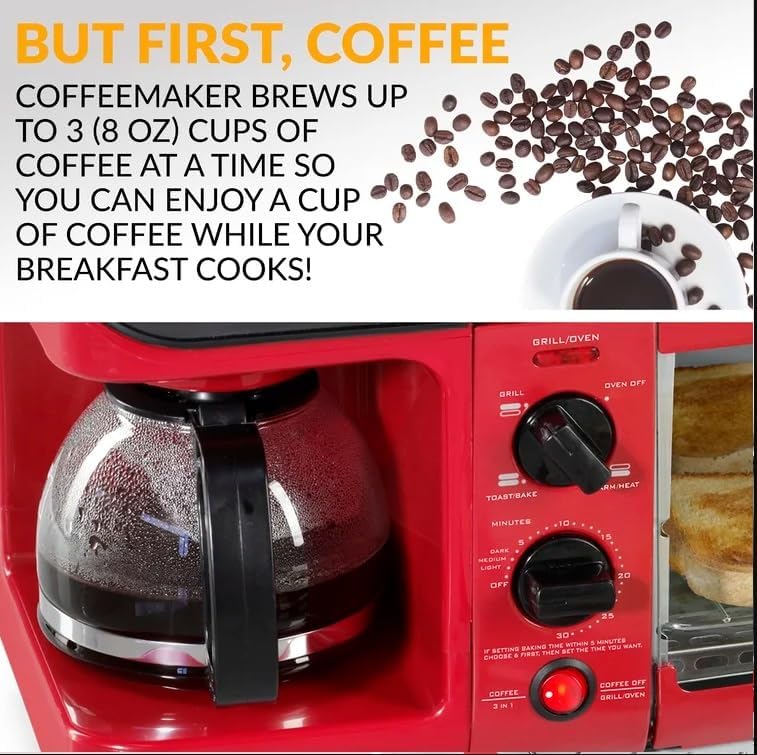 Bring the family together and makes a complete breakfast with just one appliance. Enjoy a cup of coffee with the four-cup coffee maker, then treat the family to a variety of breakfast meats and eggs cooked on the large, non-stick griddle. The multi-functioning toaster holds up to four slices of bread at a time and is perfect for 7-inch frozen pizzas, hot sandwiches, desserts, and more. For added safety, a 30-minute timer is included. When the meal is done, the griddle and oven tray remove for easy cleanup. What's Included? Sandwich Plate Griddle Plate Glass Lid Features 3-in-1: This versatile breakfast station covers your entire morning breakfast, allowing you to make your coffee, toast, and eggs all at once. 4-cup coffee maker: this coffeemaker brews up to 4 cups at a time in minutes so you can enjoy a cup of coffee while your food cooks. Comes with a glass carafe, a coffee scoop, and a reusable filter. Compact design: space-saving 3-in-1 design is perfect for small kitchens, apartments, dorms, campers/RVs. Easy clean-up: as if cooking isn't easy enough, the oven tray, wire rack, crumb tray, and nonstick griddle are removable, making cleanup a breeze. Family-sized griddle: the large non-stick griddle offers plenty of room to fry eggs, omelets, pancakes, sausages, bacon, hashbrowns, and other breakfast foods - and comes with a glass lid. Multi-functioning toaster: the toaster oven has a 30-minute timer with a glass door and can fit up to 4 slices of bread, and a 7-inch pizza, and can be used to make casseroles, cookies, and other delicious meals.