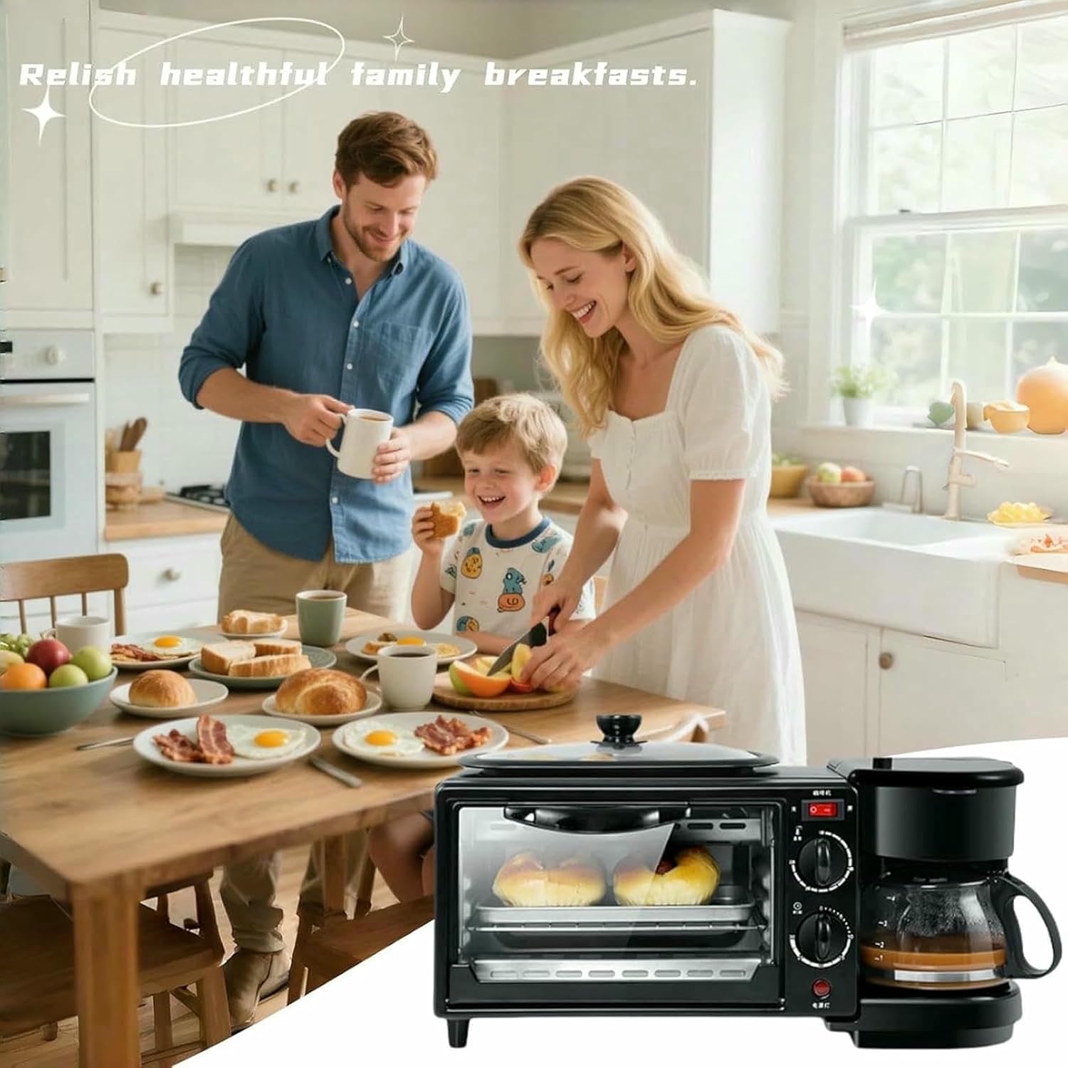 Compact Size: 17.32”L x 7.08”W x 8.26”H. Fits any kitchen. 3-in-1 Design: Toaster oven + nonstick frying pan + drip coffee maker.Why choose? ✔️ Multitask: Bake, fry, brew coffee—all at once. ✔️ 9L Capacity: Cook pizzas, wings, or toast for two. ✔️ Adjustable Temp & Timer: 100-230°C + 30-min precision. ✔️ Easy Clean: Removable nonstick pan + dishwasher-safe parts.Simplify breakfast with one appliance.