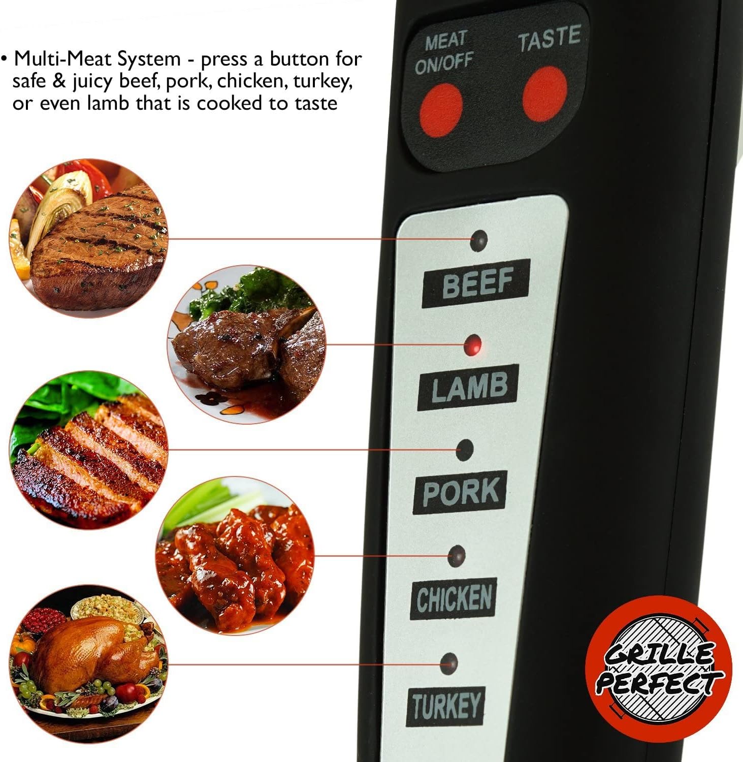 Do you hunger to be a good grill master? Cooking is not for everyone. Grilling food is particularly difficult. Searing your meat in an open flame invites all sorts of challenges. One area of concern for grilling food is overcooking. You have to check your meat and take extra caution to keep it from burning. Undercooking is also a problem–steak is the only food you'll ever want to serve rare. But all these issues can be solved given the proper tools. The Grille Perfect Thermometer and Tongs will allow you to grill meat perfectly and safely! Use the digital meat thermometer fork to cook your food exactly the way you want it. It features a Four Doneness level setting, and it can read up to five different meat types. An alarm lets you know when your meat's grilled to perfection. Thermometer says it's done with one side? Then it’s time to flip the meat with your stainless steel tongs! The 16" tongs keep you well away from the blazing heat, and the silicone handle allows you to cook with even the hottest grills. The dual-toothed tips let you work with anything from heavy pork shoulders to light and fluffy bread slices. Both the thermometer and tongs will be able to stand the heat as they are made from stainless steel. They also have nice handles that are soft to touch and give you a firm grip while grilling. Impress guests with a precision and flair reserved only for pro pit masters. Here are more reasons you need this pair of grilling tools! - Measure temperatures from -58F to 302F - Heavy-duty, 1mm thick stainless steel tongs - Thermometer comes with 2 AA batteries Arm yourself with the right utensils and grill with confidence. Add The Grille Perfect Thermometer and Tongs to your cart TODAY!