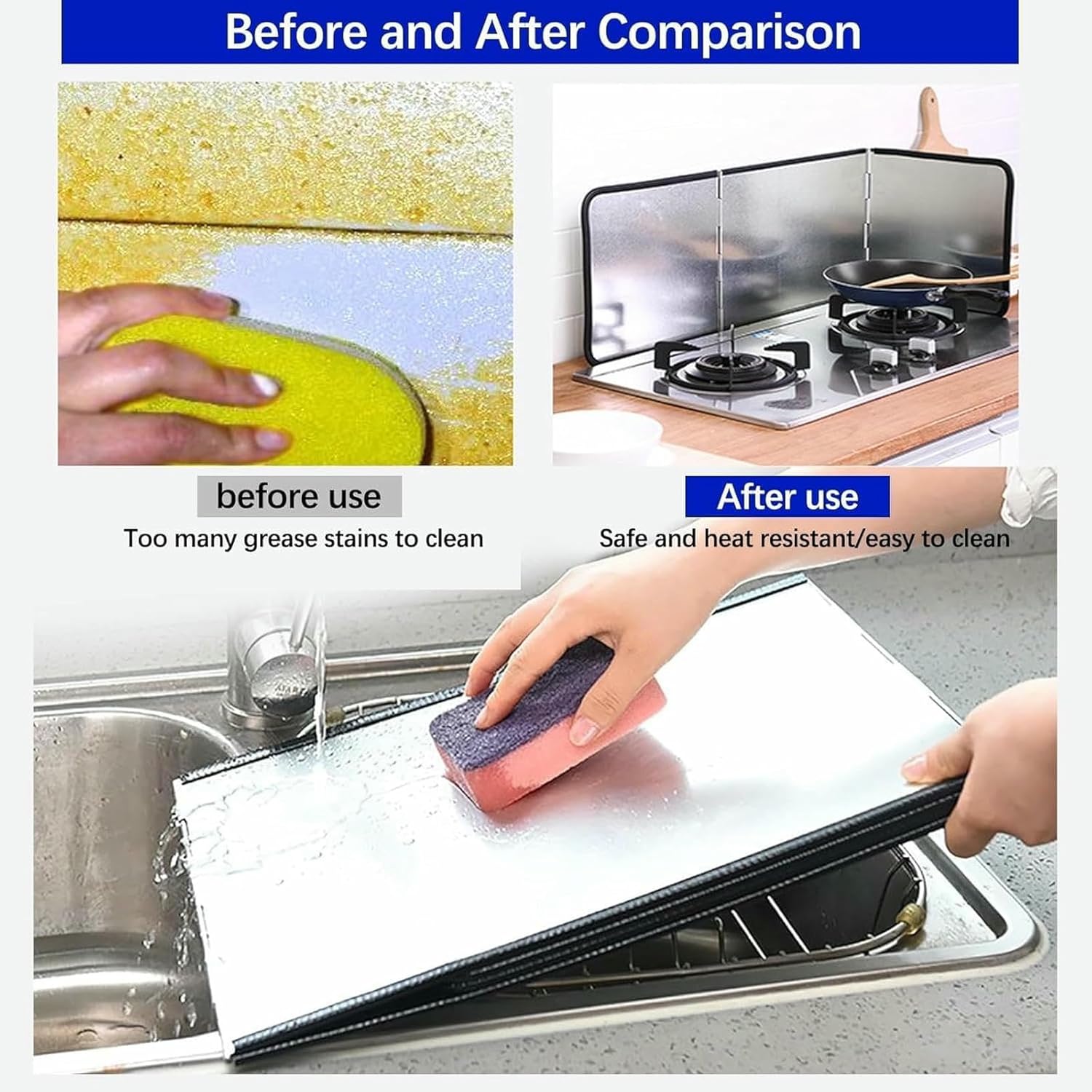 Prevent Oil Splash: the splatter guards for frying can prevent the stove and its surroundings from oil or food spills when cooking in the kitchen; They are well insulated to prevent surrounding plastics, spices, cans, etc. from being heated or deformed; You can also use them as food wash splash guardsName: Stainless steel oil baffleMaterial: thickened stainless steelStyle: three-piece foldSize: 30cm×29cm×39cmColor: silverFeatures: Suitable for users of various house types, safe and hygienicMaintenance: No maintenance required, just use it, wipe it with a towel and dry it.▶ Notes:About size---Due to different measurement methods, there may be an error of 1~3cm, please understand!About service---If you have any questions, please feel free to contact us, we will reply you within 24 hours.