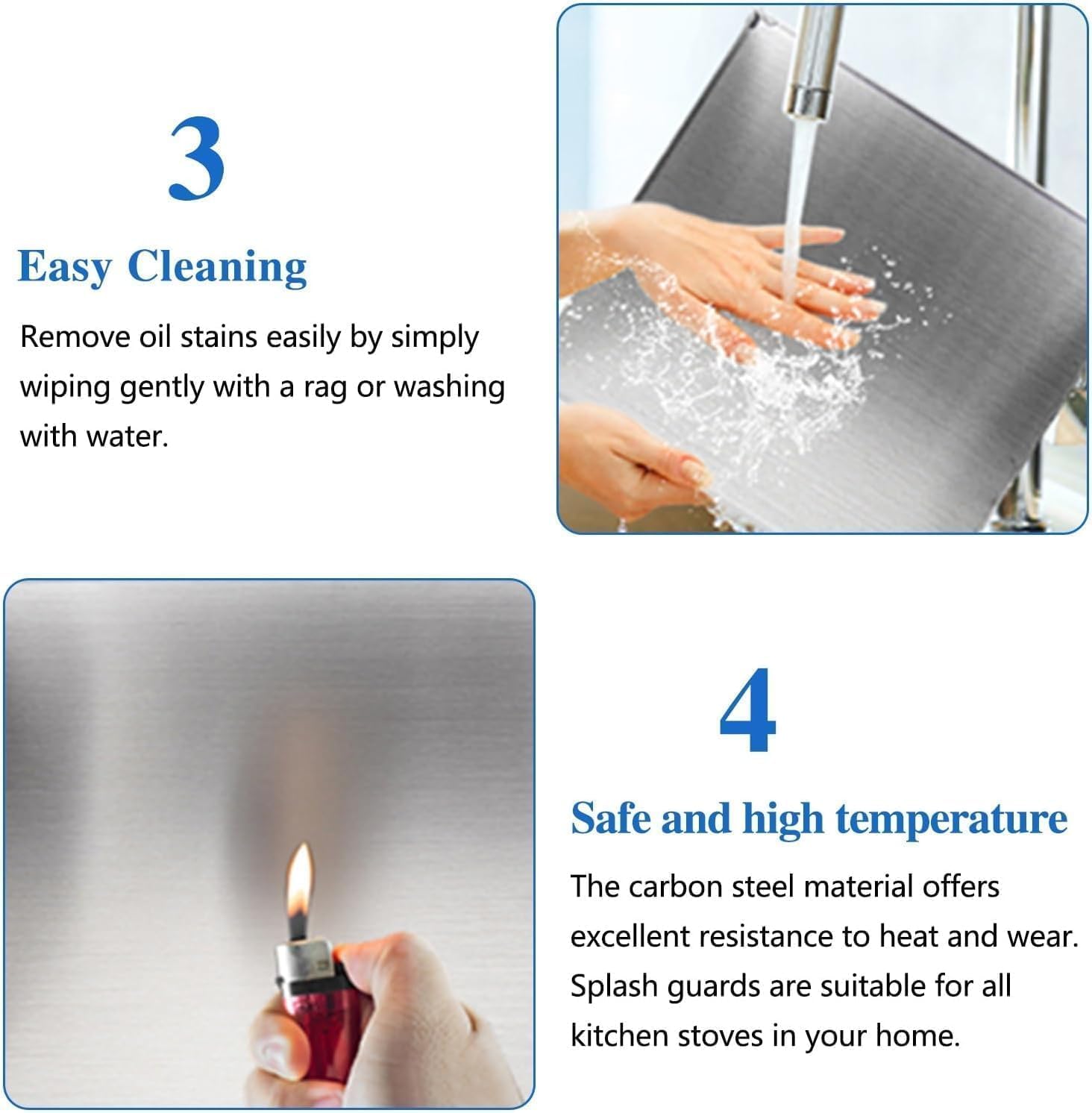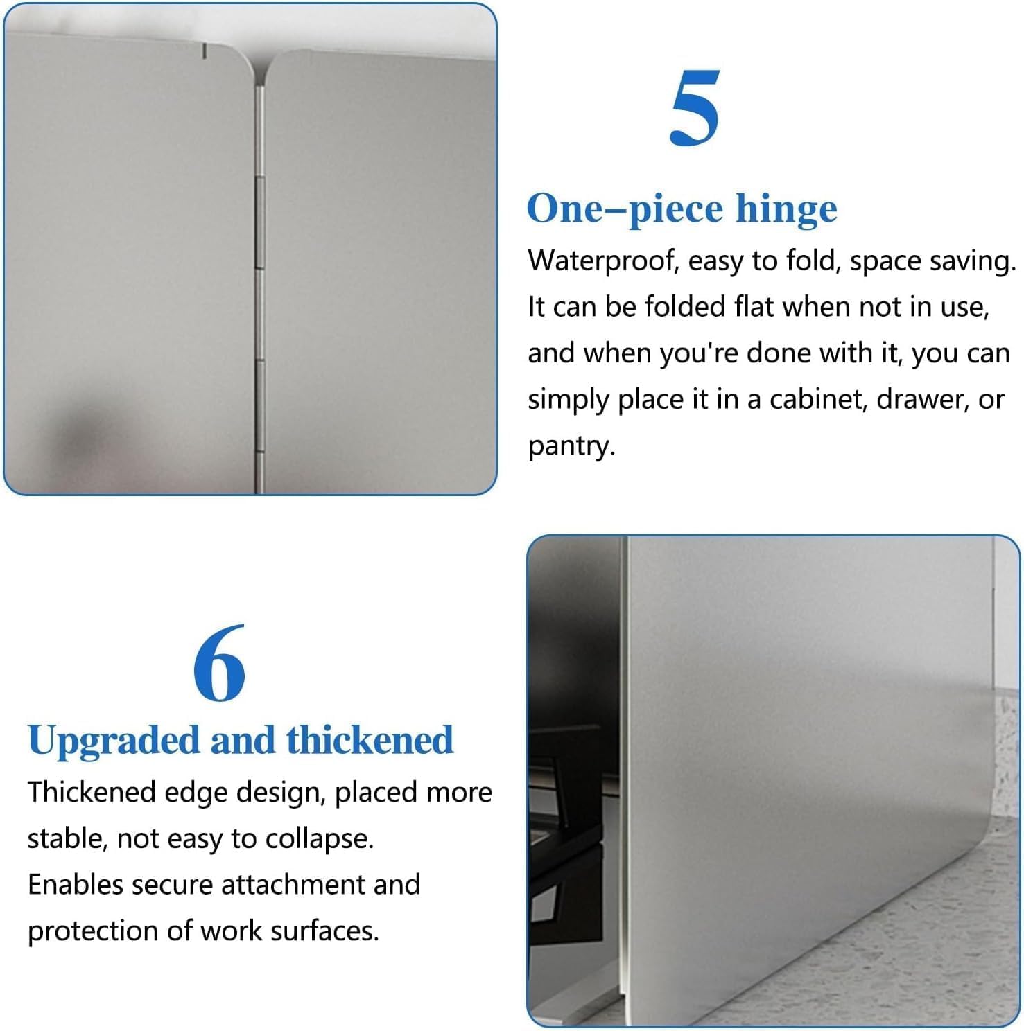 Prevent Oil Splash: the splatter guards for frying can prevent the stove and its surroundings from oil or food spills when cooking in the kitchen; They are well insulated to prevent surrounding plastics, spices, cans, etc. from being heated or deformed; You can also use them as food wash splash guardsName: Stainless steel oil baffleMaterial: Selected carbon steelStyle: four-piece foldFour-piece folded dimensions: ① 30cm high × 40cm deep × 80cm wide, ② 40cm high × 40cm deep × 80cm wide,③H45cm×D45cm×W80cm, ④H45cm×D45cm×W90cm,⑤Height 50cm×Depth 50cm×Width 100cmColor: silverFeatures: Suitable for users of various house types, safe and hygienic▶ Notes:★About size---Due to different measurement methods, there may be an error of 1~3cm, please understand!★About service---If you have any questions, please feel free to contact us, we will reply you within 24 hours.