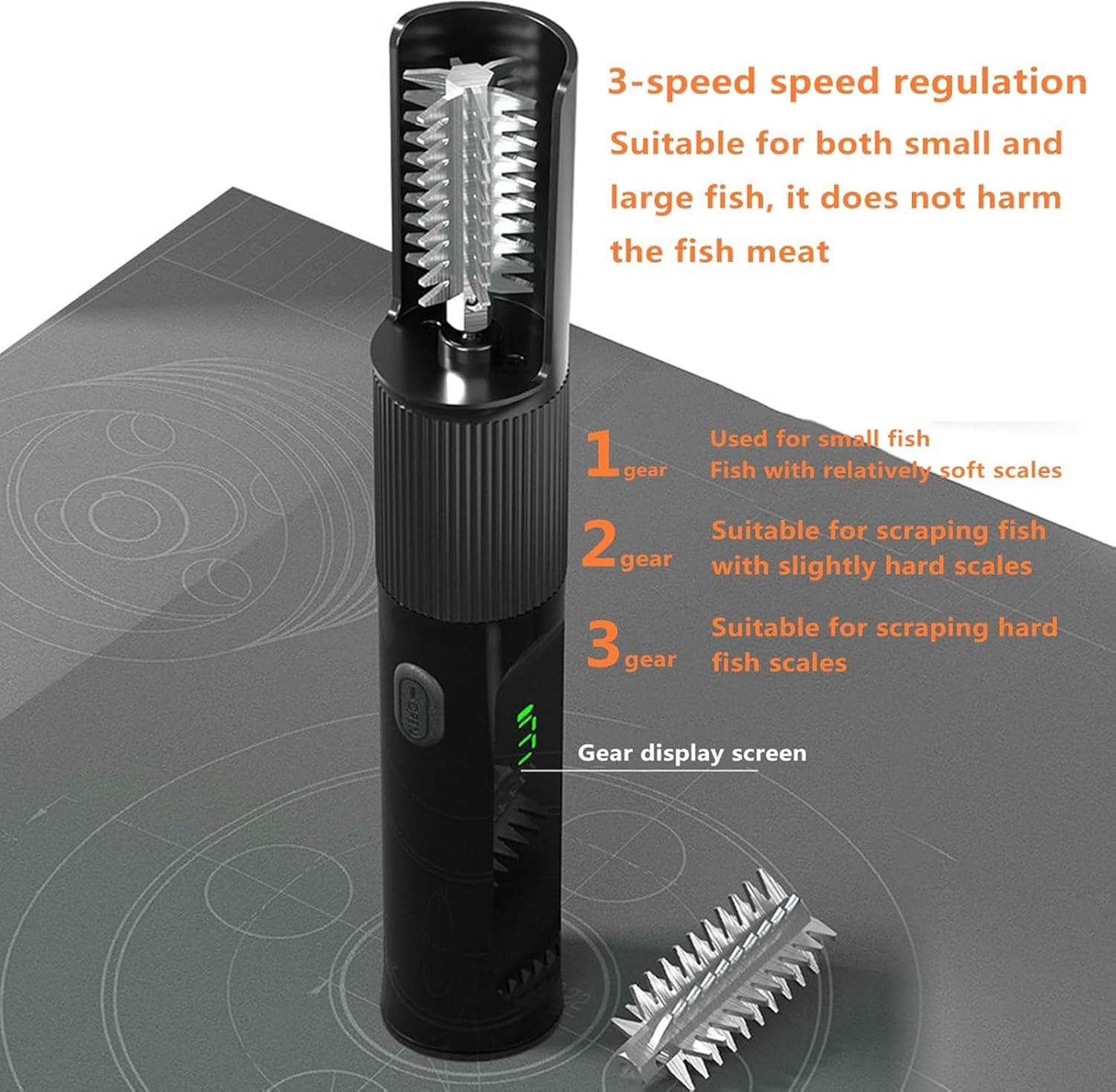 Cordless Electric Fish Scaler, Powerful Fish Scale Scraper Remover Cleaner Descaling Tool with Extra Rechargeable Battery for Left-Handed and Right-Handed People Scraping Fish ScalesEasy to clean, highly durable, and with a comfortable grip and precise sawtooths that let you remove scales with ease, even in hard to reach places. You’ll find that fish tastes far better when you don’t have to worry about chewing into fish scales.Professional Quality Fish Scale Remover to Enjoy Tastier Fish Whether you’re an avid angler or just love a good fish dinner, there’s nothing more important to your kitchen and your fishing box than the Electric Fish Scaler.1st gear : Suitable for softer fish scales2nd gear: Used for fish scales with moderater hardness3 levels: Used for relatively hard fish scalesMaterial: PC plastic+silicone+hardwareParameters:Blade length: 65MMRated input: DC 5V==2ARated power: 35WBattery capacity (2000mAh/3000mAh) * 2PSwitch type: electric control switch+press switchThe set includes:1x electric fish scale scraper