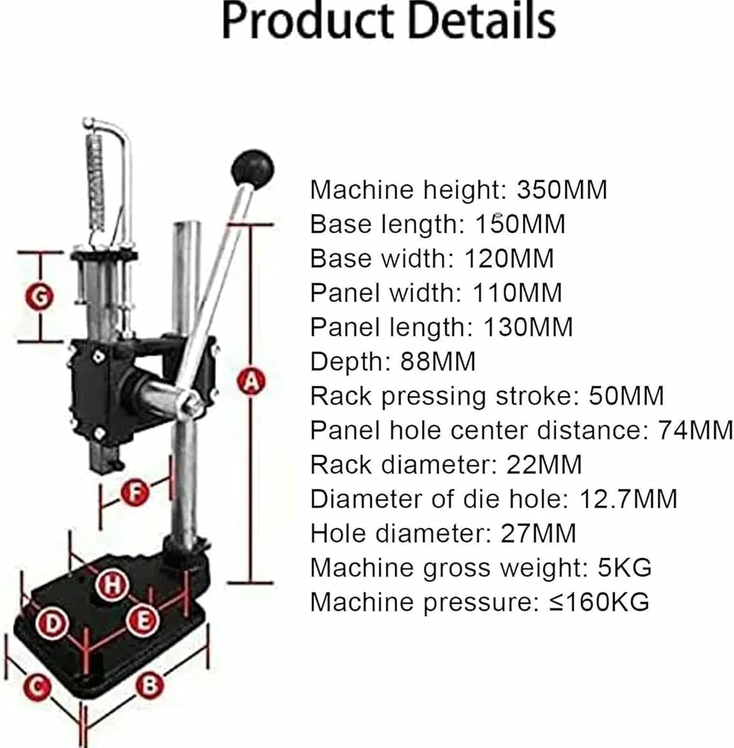 Machine height: 350MMBase length: 150MMBase width: 120MMPanel width: 110MMPanel length: 130MMThroat depth: 88MMRack press stroke: 50MMPanel hole center distance: 74MMRack diameter: 22MMAperture: 12.7MMCutting hole diameter: 27MMMachine gross weight: 5KGMachine pressure: 160KGApplicable age: 18 years old or older