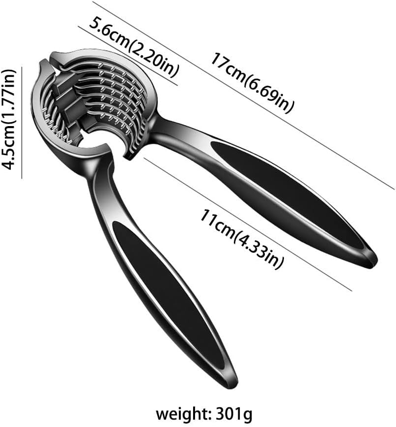 Product Name: Walnut ClipProduct material: zinc alloyProduct weight: 301 gramsProduct size: The total length is about 6.69 inches (17CM), the handle length is about 4.33 inches (11CM), the diameter of the walnut shell groove is about 2.20 inches (5.6CM), and the height is about 1.77 inches (4.5CM).Prompt:1. Due to the difference of light and shooting angle, there may be slight chromatic aberration, please understand.2. Please confirm the size of the walnut clip before purchasing.3. The product picture only includes the Nutcracker itself, and does not include other products.4. Manually measure the size, there may be some small errors, please refer to the actual product, thank you.5. Welcome to share and feedback, we can provide you with better products and services.6. If you find any problems with our products, please feel free to contact us via email, we will solve these problems as soon as possible.It is not only beautiful in appearance and comfortable to use, making cooking more enjoyable, but also a perfect gift for your friends and family.