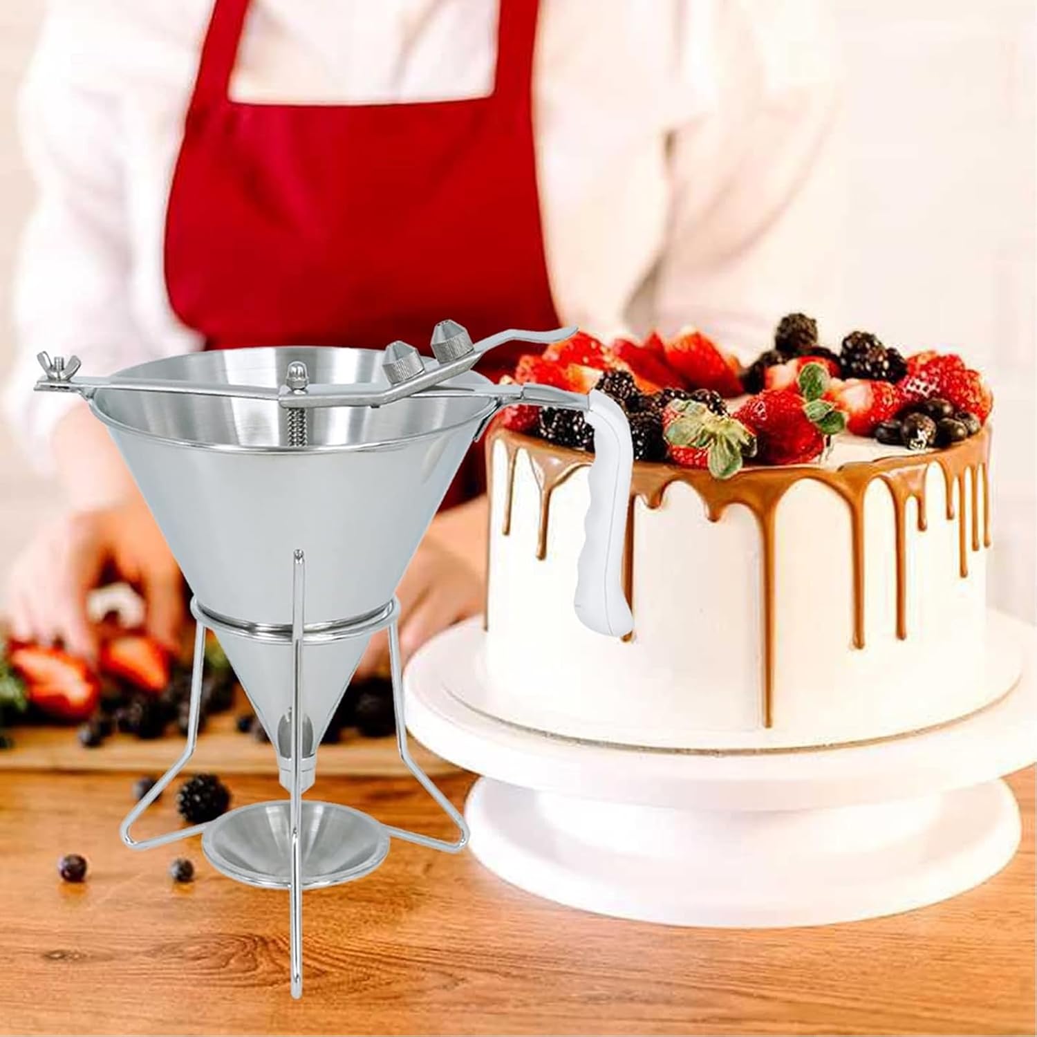**Features:**1. Crafted from food-grade stainless steel, this product boasts anti-rust and anti-corrosion properties, ensuring sturdiness and durability.2. Designed with an ergonomic plastic handle for simple operation and convenience.3. Includes three stainless steel discharge nozzles in sizes of 5.56mm, 4.71mm, and 3.58mm, along with a 1.8L funnel capacity to meet all your daily needs.4. Comes with a sturdy stainless steel bracket for easy storage after use; the three-legged design ensures stability during operation.5. Ideal for modern family kitchens, cake shops, bakeries, juice shops, and more.**Specifications:**- **Name:** Baking Piston Funnel- **Material:** Stainless steel- **Color:** Silver- **Capacity:** 1.8L- **Discharge Nozzle Sizes:** 5.56mm, 4.71mm, 3.58mm- **Product Size:** 18.41 x 18.41 x 23.49 cm- **Net Weight:** 1.8 kg**Package List:**- 1 x Funnel- 1 x Bracket- 3 x Discharge Nozzles- 1 x Receiving Bowl