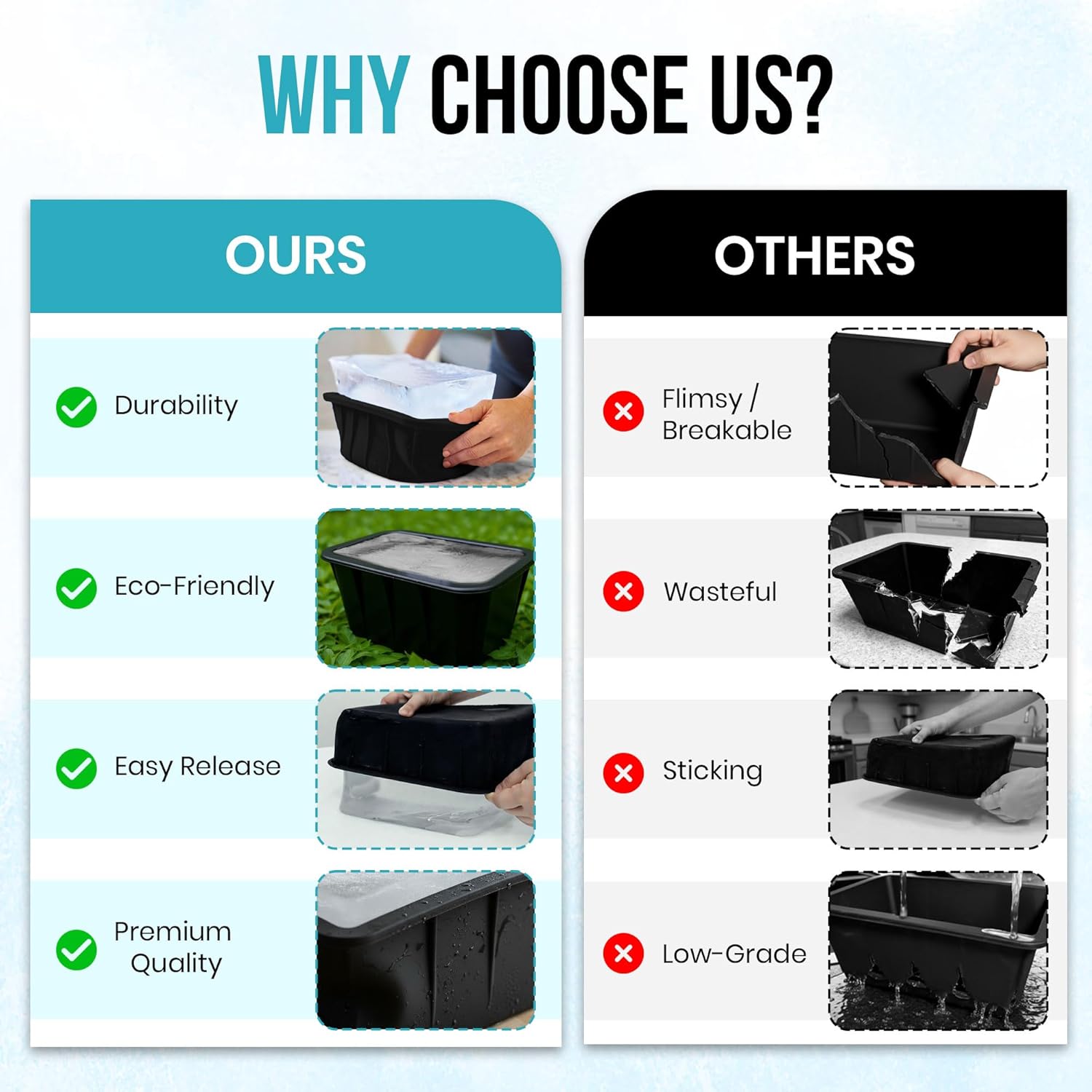 Introducing the Extra Large Ice Block Mold, a revolutionary way to create perfectly sized ice blocks for your ice bath or cold plunge. Made with high-quality silicone, this mold is easy to use and produces giant 8 lbs cubes of pure ice. Say goodbye to constantly refilling small cube trays or struggling with larger molds that are difficult to remove from the freezer. Our Extra Large Ice Block Mold is designed for efficiency and safety, ensuring that you have more time enjoying your cold therapy rather than preparing it. With its sturdy construction and precise measurements, each cube will fit seamlessly into your desired container without wasting any water or space. Upgrade your chilling experience today with our premium silicone mold!