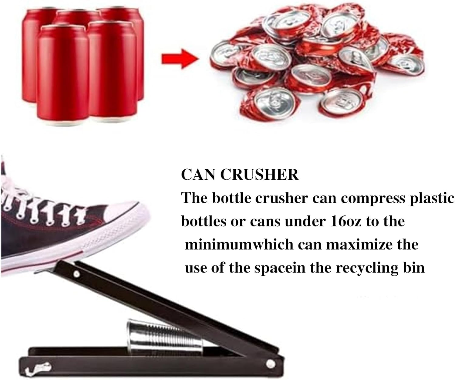 Description:Material: Heavy duty steel, strong and durable, can flatten aluminum cans quickly and easilyEasy to use: Put the can crusher on the ground, open the locking device on the side, adjust the position of the metal rod to prevent the can from sliding out, then put the can in, step on the can crusher with your foot, and you can easily crush the can.Applicable bottles: Suitable for various aluminum cans such as beer cans, soda cans, etc. It is also suitable for various plastic bottles, but please make sure the maximum size of the bottle does not exceed 18 ounces (530 ml).Easy to store: Use the small switch on the side to close it easily, which is convenient for storage and can save a lot of space when not in use.No installation required: Just put it on the ground, turn on the switch and start using it immediately. No installation is required. You can carry it to various places such as the kitchen and garage.Product Name: Can Presserpacking list1* Can crusher wall mountedNote:Please allow 1-3CM differs due to manual measurement.Please tell us first when you have any problem, we will give you the best service and solve the problem ASAP. Thank you so much.