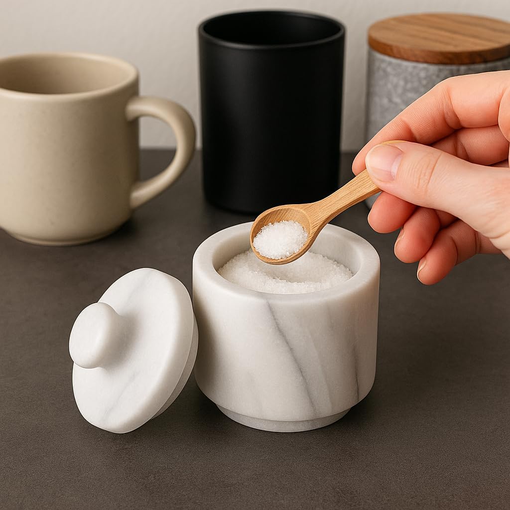 The natural marble salt cellar, keeper, spices container is made of 100% solid marble with matte finish. It is non-porous, easy to clean and keeps moisture, grease and odors from penetrating. Makes this salt cellar the perfect container for not only salt, but for spices, pepper, sugar, and more. Hand crafted and carved from natural marble, any color variation is its own uniqueness. Each piece has unique color and pattern variations. Durable, weighted natural marble keeps salt cellar, keeper sturdy and increases its stability.