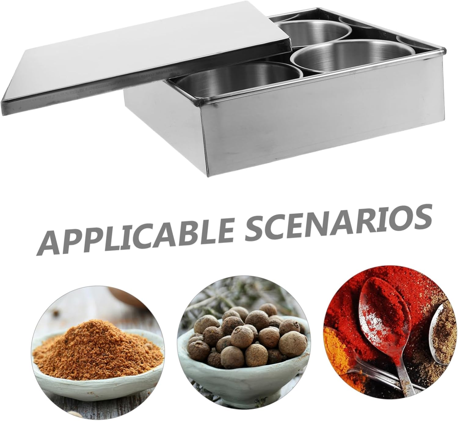 Package List 1 x seasoning box Features -Material:Stainless steel spice container -Versatile storage: besides spices and sauces, this box is great for storing small items like jewelry, and other household items seasoning containers -Stylish japanese aesthetic: the simple yet stylish japanese design makes this spice box a beautiful addition to any kitchen or dining setup food storage containers -Sturdy stainless steel: made from stainless steel, this seasoning box is designed for durability and easy maintenance steel seasoning bin -Size:22.70X22.70X6.50cm/8.92X8.92X2.55in stainless steel seasoning -Multiple compartments: this spice box includes four compartments, allowing you to keep different spices and seasonings neatly organized stainless steel seasoning jar -Color:Silver spice containers -Sealed lid: the airtight lid that your spices remain dry and fresh, preventing any moisture from affecting their ingredient containersGoods Descriptioningredient containers Ideal for both home cooks and chefs, this stainless steel seasoning box offers a convenient store and access your spices.spice containers Its sturdy construction it can withstand daily use in a busy kitchen environment.steel seasoning bin The four separate compartments help maintain the freshness of your ingredients
