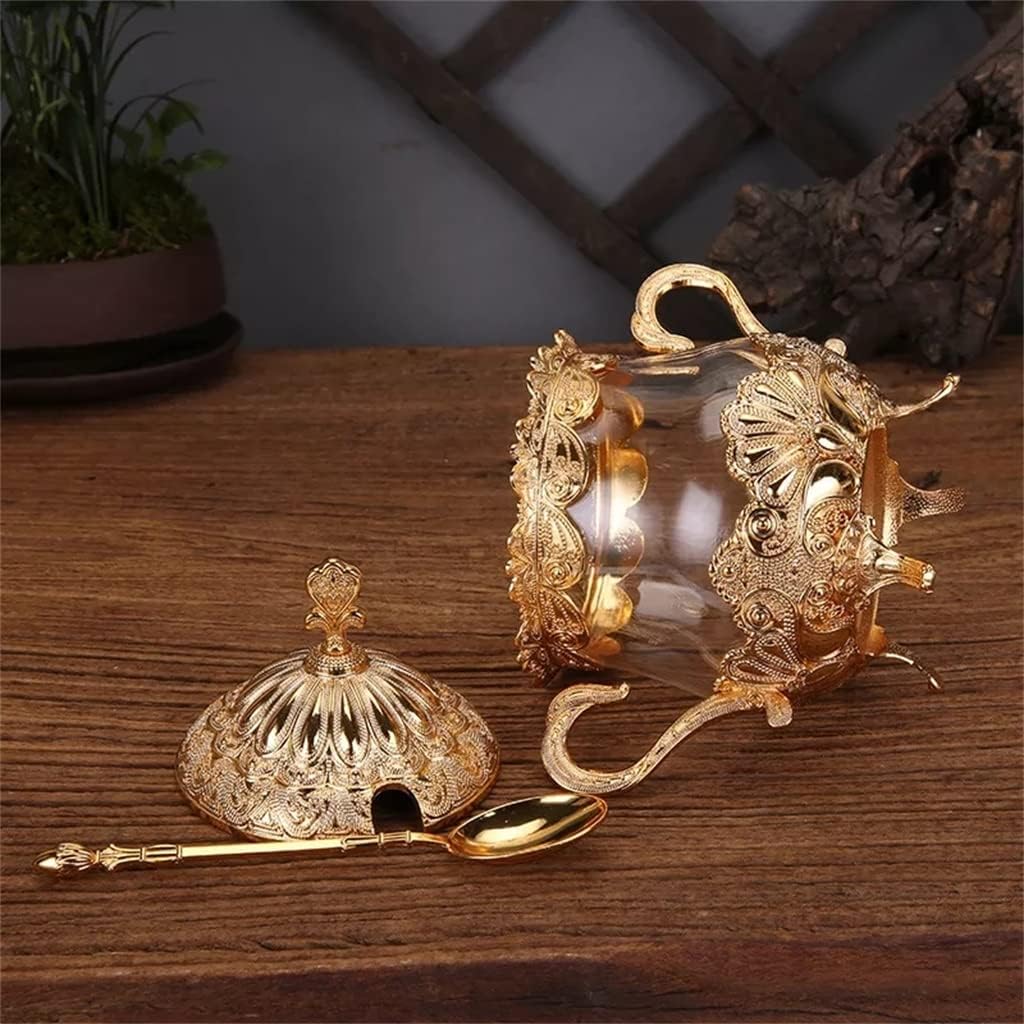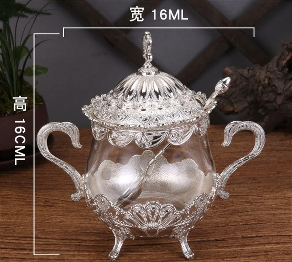 DescribeAlloy cover, exquisite engraving, visual beautyStable use, high-end atmosphereInternal glass design, not easy to corrodejar and spoon design to prevent different seasonings from intermingling with each otherDrum-shaped design, with handles on both sides not easy to fall off, more convenient to useProduct parametersMaterial: Zinc alloy, glassApplicable space: kitchenColor: gold, silverSize: 16x16cmApplicable : the publicPackage includes: spice container * 1 piece (excluding other demo products)notes:1. Due to different monitors and lighting effects, the actual color of the product may be slightly different from the picture color. Thanks!2. Due to manual measurement, the allowable measurement deviation is 1-3cm3. Due to material and process problems, there will be some peculiar smell when receiving the goods. After washing, put it in a ventilated place to ventilate to remove odors.