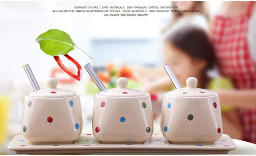 Products include: Polka Dot kitchen spice jar: European minimalist Process: glaze, painted dotsMaterial: CeramicKit Type: ceramic pot 3 *, 3 * spoon, cap * 3, * porcelain chassis 1Application of space: KitchenKeep clean: Good work in the kitchen table, kitchen or bathroom area and neater, you can stand on the table or next to the store cookware sink for ease of use.Versatile: can be carried out in any room in the house to store, classify, in cabinets, shelves, countertops or in the pantry.The bottom is transparent, the inner seasoning is clear
