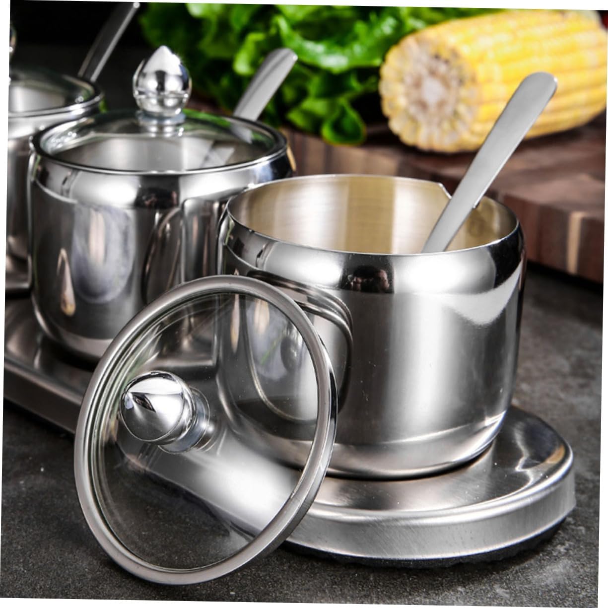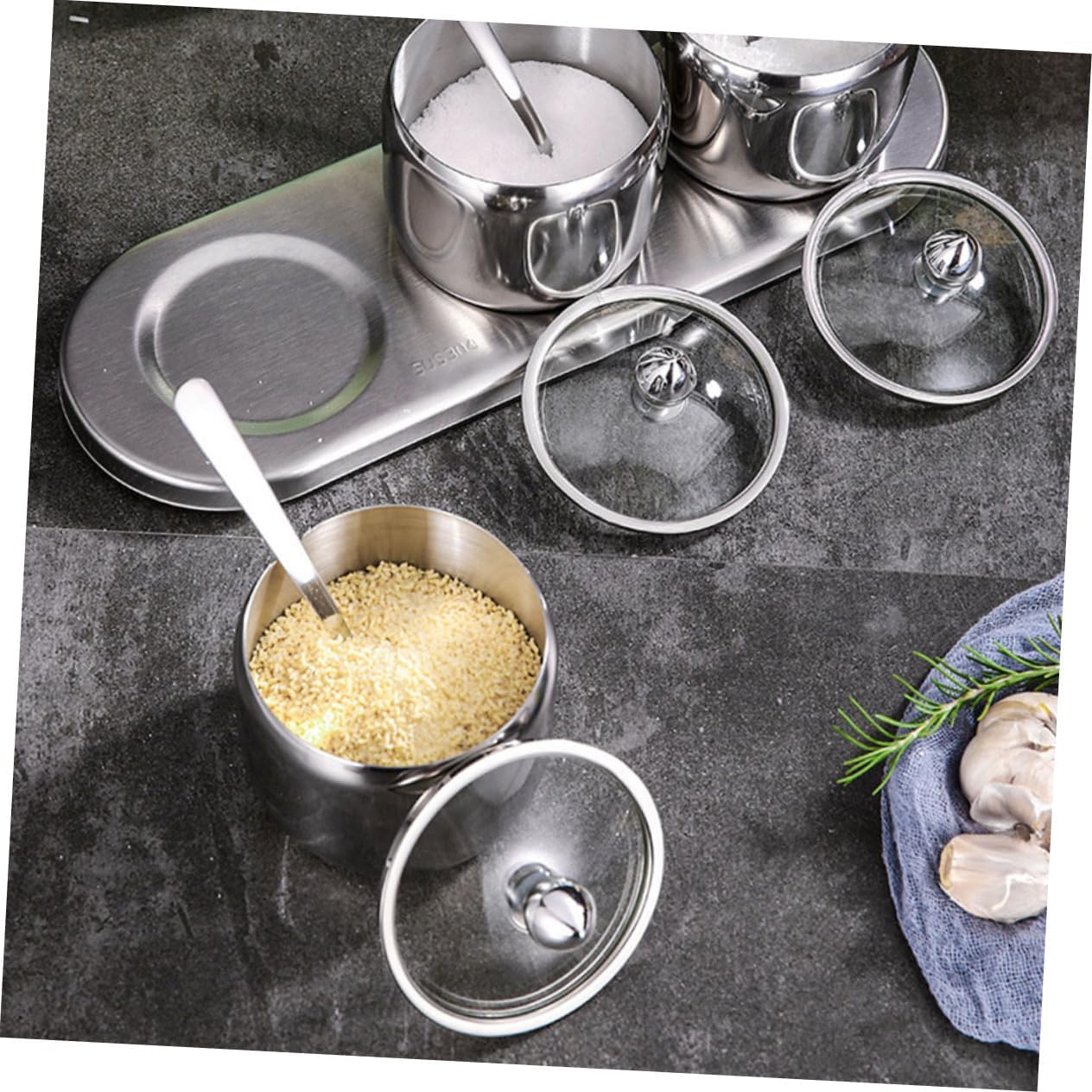 Package Include 3 x Seasoning jar 1 x Seasoning base Features - Size: Approx. 30 x 10 x 6.5cm Salt storage container. - Color: As shown. - Material: Stainless steel and glass. - Absolutely a storage accessory for households Seasoning jar. Stainless Steel canisters - addition next to your range or cook-top, makes a lovely addition to the breakfast table, buffet or special occasion tea party Spice containers. - Made of food-grade stainless steel, it is and for use storage jars. - The storage jar can be used as a coffee jar, tea storage canister, sugar jar, container, candy jar and more. - This modern storage jar is highly functional and will match any decor.Goods DescriptionSpice containers Add a touch of elegance to your kitchen with this stainless steel seasoning jar.Seasoning jar This item is a multipurpose seasoning storage jar with spoon.Salt storage container You can store salt, pepper, chili, sauces, sugar and other condiments.storage jars Suitable for home, hotel, cafe, buffet, party, etc