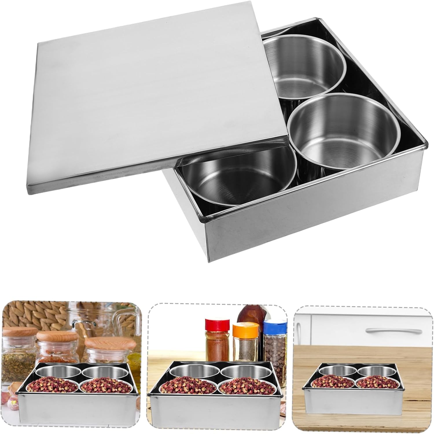 Package List 1 x seasoning box Characteristics -Excellent sealing: the lid is designed to be airtight, preventing moisture from entering and keeping your spices fresh and flavorful ingredient containers -Material:Stainless steel steel seasoning bin -Color:Silver stainless steel seasoning jar -Versatile use: this box is not only great for storing spices and sauces but can also be used to keep small items like jewelry, and more seasoning storage case -Multicompartment design: the stainless steel spice box features four compartments, allowing you to store various seasonings separately for easy access and organization food storage containers -Size:22.70X22.70X6.50cm/8.92X8.92X2.55in stainless seasoning container -Japanese style: designed with a minimalist japanese aesthetic, this spice box is both elegant and functional, making it suitable for both home and restaurant use seasoning containers -great material: made from great stainless steel, this seasoning box is built to last and is easy to clean, ensuring longterm use kitchen spice holder stainless steelGoods Informationseasoning containers This stainless steel spice box is designed with a sleek, modern aesthetic that complements any kitchen decor.stainless seasoning container The great stainless steel construction longevity and easy cleaning, making it a practical addition to any household.stainless steel seasoning jar Featuring four compartments, it allows for organized storage of various seasonings, spices, and sauces