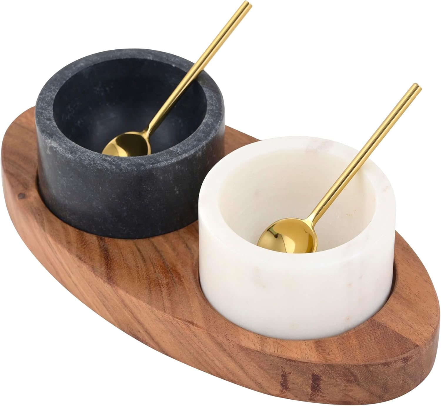 Cruiser’s Caché Marble Salt Cellar Set of 2 with Gold Spoons and Wood Tray. DESIGNED FOR GOURMETS - Elegant and simple design is both beautiful and useful. Mango wood lids protect your salts and spices, the wood spoons make for easy use. Perfect for storing Himalayan, Kosher, and gourmet salts as well as specialty spices. KEEPS SPICES STYLISHLY STORED AND ORGANIZED - Keep you salts and spices organized and easy to use, these beautiful spice boxes look amazing next to the stove or on a dining room table. UNIQUE GIFT - Gifts for the gourmet, house warming gift, birthdays, hostess gift. Perfect for use as dipping or condiment bowls.