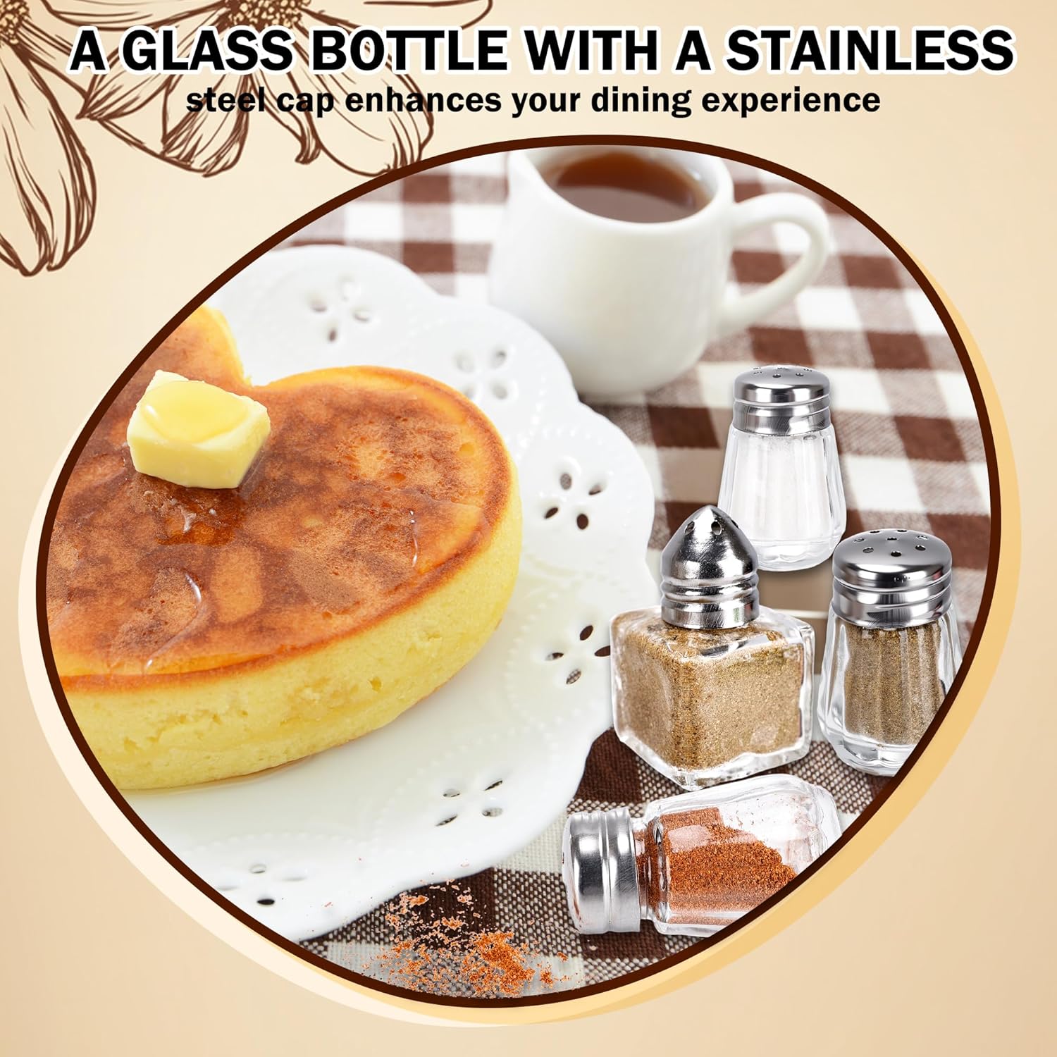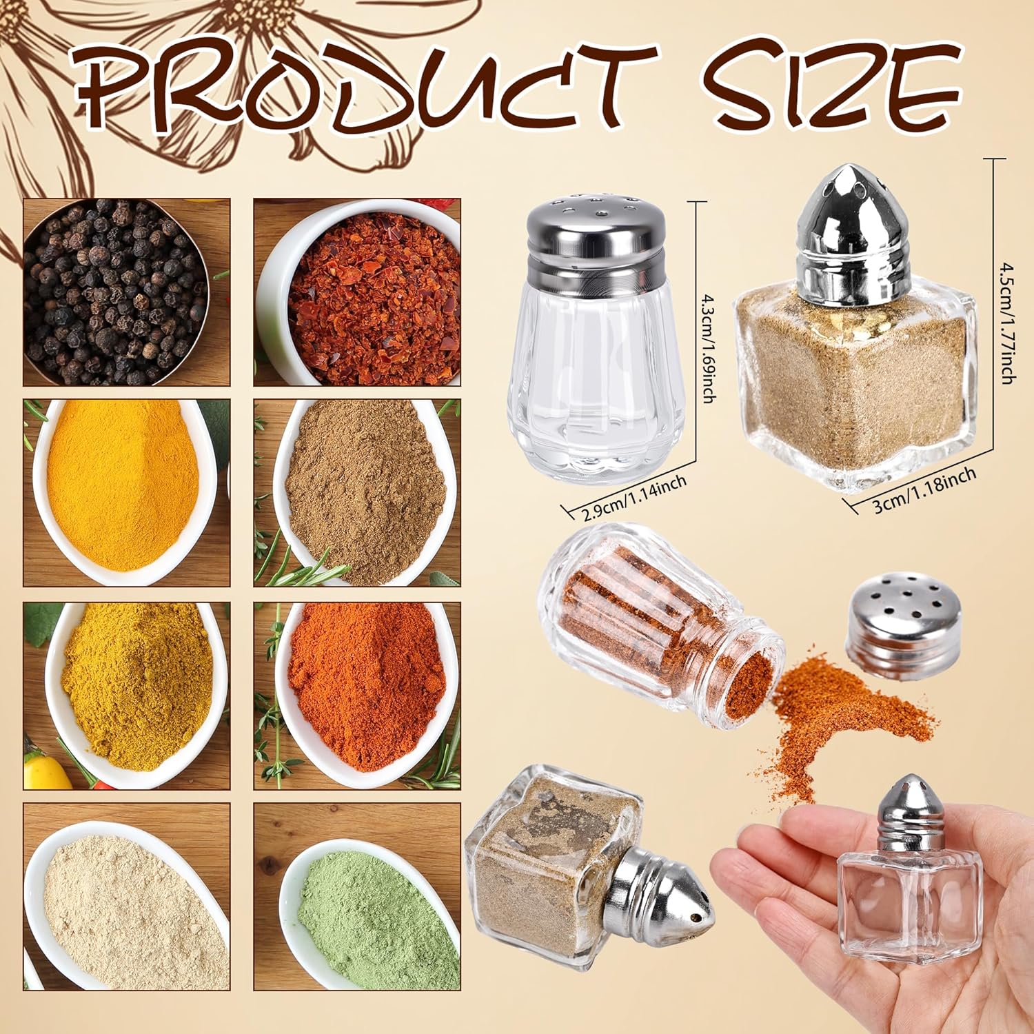 ✅Glass Salt Shaker Bulk Product Details: Material: glass Size: x 4.5 cm/ 1.18 x 1.77 inch and 2.9 x 4.3 cm/ 1.14 x 1.69 inch Color: clear Quantity: 100 pieces ✅Mini Salt Shaker Special Feature: the clear mini salt shaker design makes the types of seasonings clearly visible, allowing for quick and easy access; it also allows you to clearly see the remaining amount and replenish as needed. Two different styles of seasoning bottles are available to meet different usage habits and combination needs ✅Packaging: 100 x Salt and Pepper Shakers