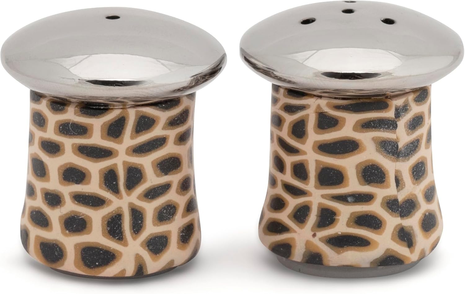 Compliment your dinner table with these silver-plated salt & pepper shakers, decorated with a dark giraffe print. This matching and compact set is ideal for bringing an African flare to your meal, whether it be in the comfort of your own home or on your adventures outdoors. Receive your dark giraffe set in style – beautifully packaged in a wooden gift box and cushioned with confetti.