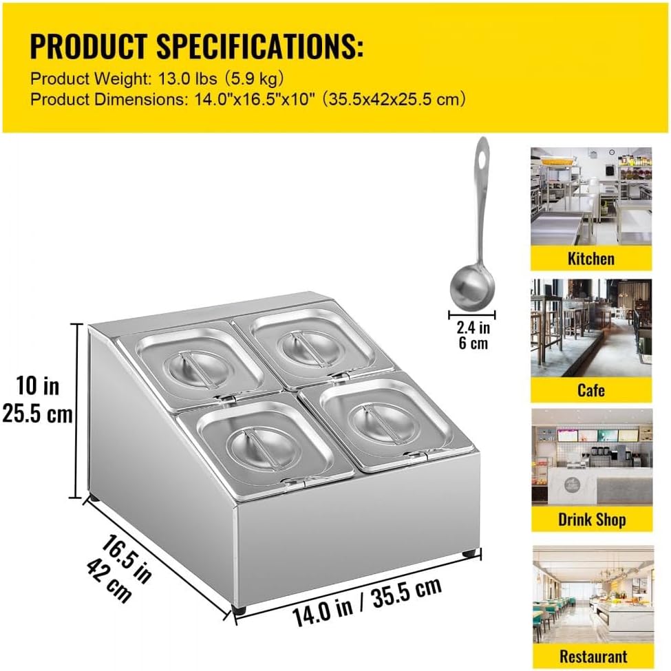 Stable and Reliable Spice Rack ShelfOrganize your kitchen pantry with our trapezoid-shaped spice rack shelf. It includes a stainless steel stand that can hold up to 33lbs/15kg and four stainless steel 1/6 pans for storing spices, sauces, seasonings, and more. The holder measures 14.0"x16.5"x10", providing ample space for all your ingredients. The non-skid feet provide stability, so you don't have to worry about the rack tipping over.Easy to Use and CleanOur spice rack shelf is designed to make your life easier. You'll receive four 1/6 pans, each with its own lid and ladle. The hygienic 304 stainless steel pans are easy to clean and have a capacity of 2.6 Qt/2.5L. The detachable compartments make cleaning a breeze, while the hollow frame can be wiped down with a wet or dry cloth for easy maintenance.Convenient and VersatileDesigned for comfort and convenience, our spice rack shelf features an inclined design that makes it easy to see what's in each container, so you can quickly find what you're looking for. Use it to store spices, sauces, coffee beans, fruits, vegetables, and more. Our countertop spice rack is ideal for use at home, in cafes, restaurants, or other commercial kitchens. Made from high-quality stainless steel, it's built to last and will provide years of reliable use.
