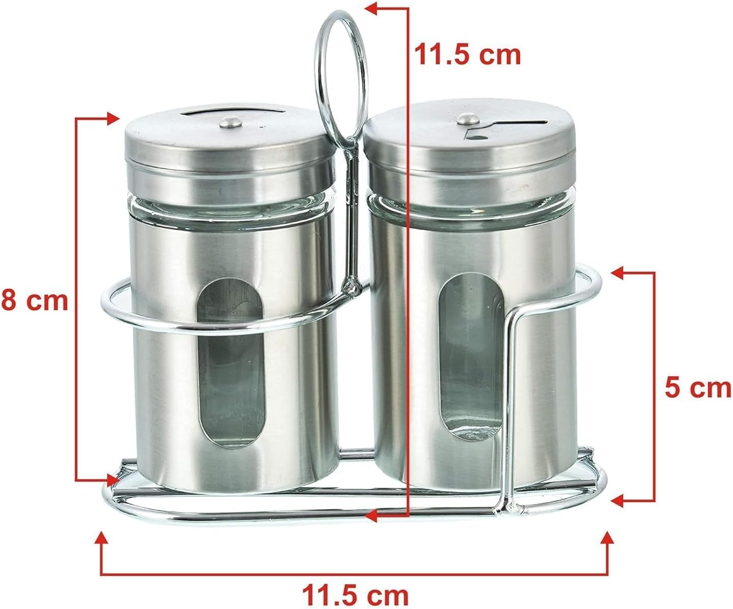 Elevate your dining experience with this sophisticated salt and pepper shaker set featuring a sleek stainless steel exterior and durable glass interior. The set includes two elegant shakers measuring 8.38 cm in height and 4.83 cm in diameter, perfectly sized for everyday use. Each shaker comes with an innovative rotative lid featuring three different hole patterns, allowing you to adjust the flow of seasonings to your preference. The transparent viewing window lets you monitor content levels easily, while the chrome-finished stand keeps your shakers organised and readily accessible. The glass interior ensures pure taste preservation, while the stainless steel exterior provides durability and a modern aesthetic that complements any table setting. The ergonomic design makes refilling simple, and the secure-fitting lids prevent unwanted spills. This versatile set brings both functionality and style to your dining table, making it an essential addition to your kitchen accessories.