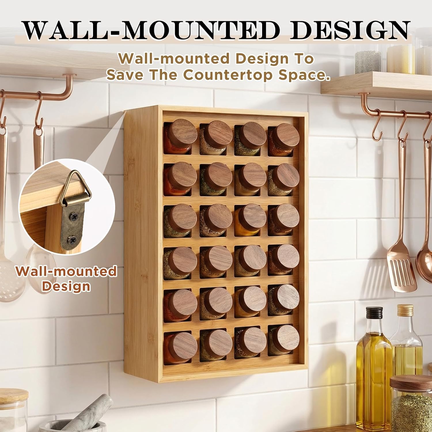 Features: Beyond just spices, the wooden spice rack wall mount is ideal for storing various small kitchen items. This wall mounted spice rack not only saves space but also enhances the organization of your kitchen. Specifications: Material: solid bamboo Color: wood color Size: 15.94 x 4.72 x 11.22 inches/ 40.5 x 12 x 28.5 cm Package includes: 1 x Bamboo spice rack 2 x Hanging rings 4 x Non slip round pads Notes: Manual measurement, please allow slight errors on size. The color may exist a slight difference due to different screen displays.