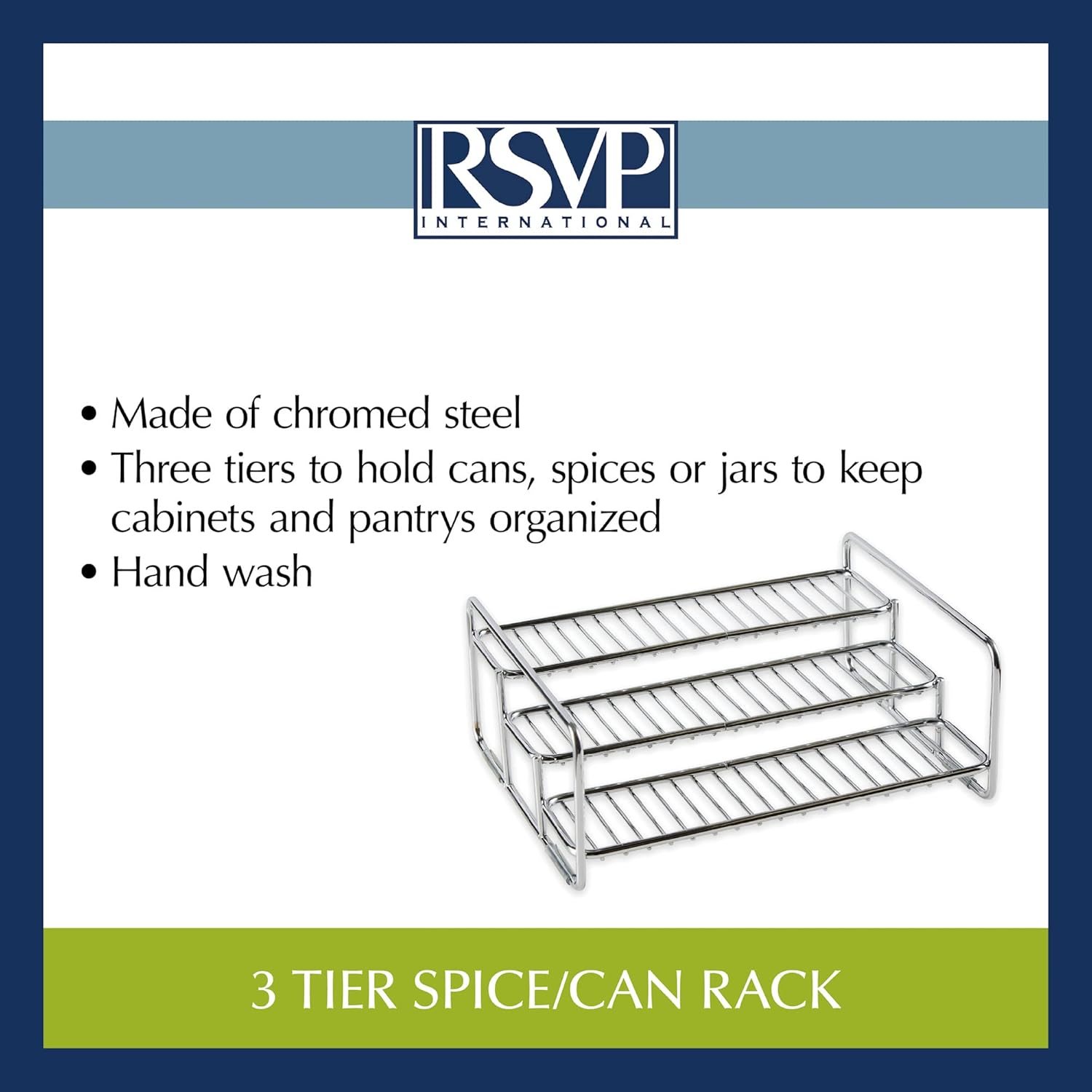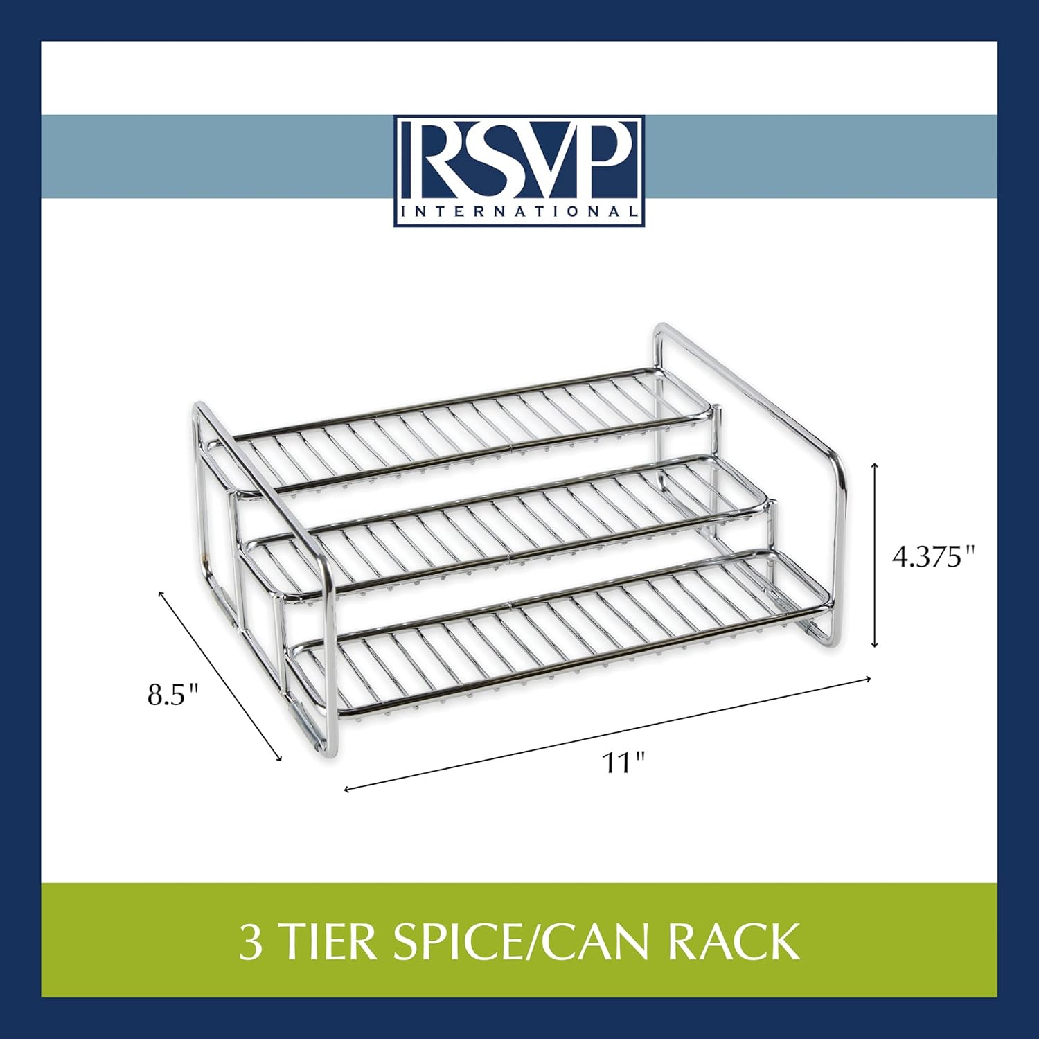 4.25 inches tall, 11 inches wide, and 8 inches deep. This rack will quickly and easily help you organize your cans and containers. This rack fits in almost any cabinet or pantry. Chromed steel frame holds 3 tiers of cans, bottles, and spices. Hand wash.