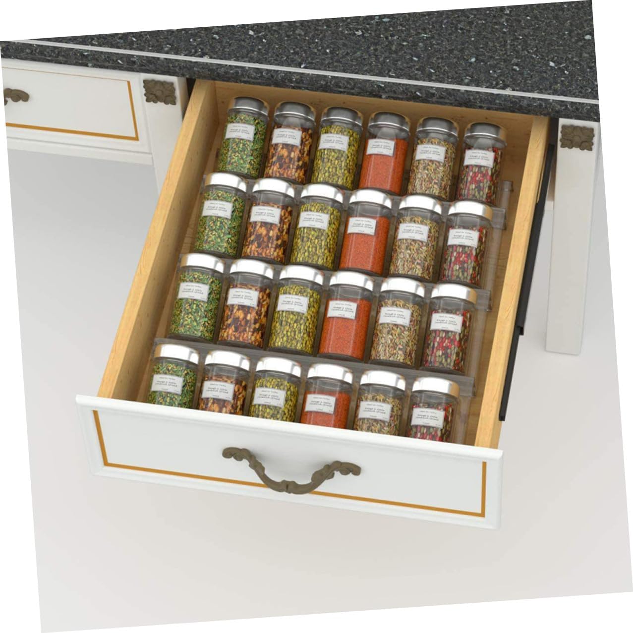 Package Include 1 x Spice Bottle Rack Set Features -Product Info:Seasoning storage rack - Material: Acrylic. - Size: 45.00X34.00X4.30 cm/ 17.68X13.36X1.69 inch. - Color: Transparent. - Easy to install, just place in it kitchen drawers and to the size that fits. - It has strong bearing capacity, is not easy to be damaged, and can be used for a long time spice rack cabinet. - This storage rack can store various seasoning bottles, spice bottles, sauce bottles, etc Spice Bottle Rack. - Made of premium acrylic materials, strong and , not easy to deform. - The tilted design make it quick and easy to find the spice bottles, convenience to use space saving spice rack organizer.Goods Informationkitchen spice drawer insert This not only saves space, but also puts all the spice bottles in your drawer.Plastic Spice Rack Do you need a seasoning rack? If so, our product can meet you needs.tiered drawer organizer Using acrylic materials, , multi-tiers design can store more seasoning bottles in the kitchen