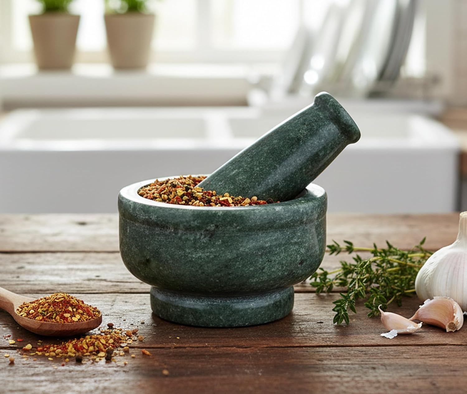 KLEO - utilities and decor to redefine your environment. Our product range is not only stylish and chic but also works with artisans to keep their skills alive. This fabulous mortar and pestle is made of a piece of natural stone. The wonderful characteristics of natural stone make each piece unique and special! Using a mortar and pestle is a centuries-old method of food preparation that is still considered the best way to release the full and true flavors of herbs and spices. This solid round mortar and pestle is a beautiful contemporary style green natural stone and features a felt-lined base to protect work surfaces. Easily used by chefs and pharmacists. Each product is designed with color neutrality in mind so that it matches all colors in your home. Our products are of high quality and very durable. Please note that each piece may have slightly different colours and natural lines due to the natural aspects of the stone. dimensions - size - 10 diameter x 6.5 cm height weight - 500 g