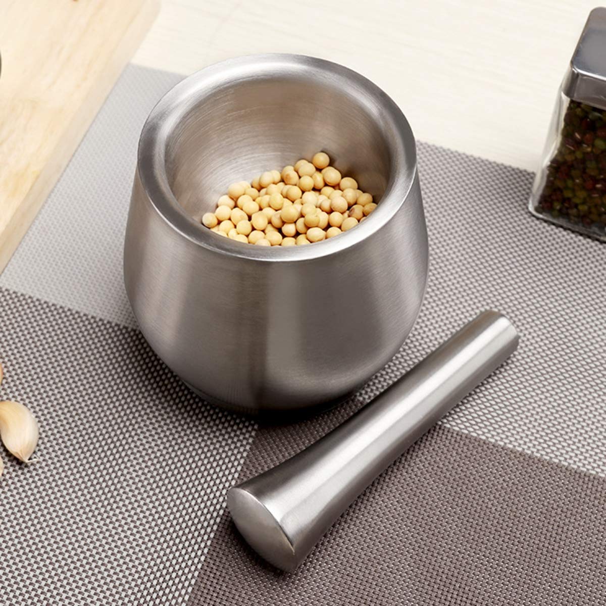 Stainless steel mortar and pestle,with lid Both mortar and pestle are made of food grade stainless steel. Not only is it rustproof, it is also resistant to corrosion by acidic food. You do not have to worry about chipping it with heavy strikes. It is fit and safe for crushing and grinding all kinds of ingredients. Translucent lid allows you to watch your ingredients keeping flying debris from making a mess. The mortar sits unmoving on your counter because of its weight and anti-slip padding on the bottom. Easy to Clean Stainless steel won't produce residue or odour, it is easy to clean it with mild detergent and rinsing under the tap. Applications From medical s, to and spices; Excellent addition to your kitchen for crushing and grinding ingredients to makes pastes, dressings, pesto and seasonings with ease. Material: stainless steel + PP cover Specification: 115MM high, 110MM outer diameter, 80MM inner diameter, 145MM length of pestle, 40MM diameter of pestle head Net Weight: Mortar weight 1.7KG Pestle weight 0.2KG