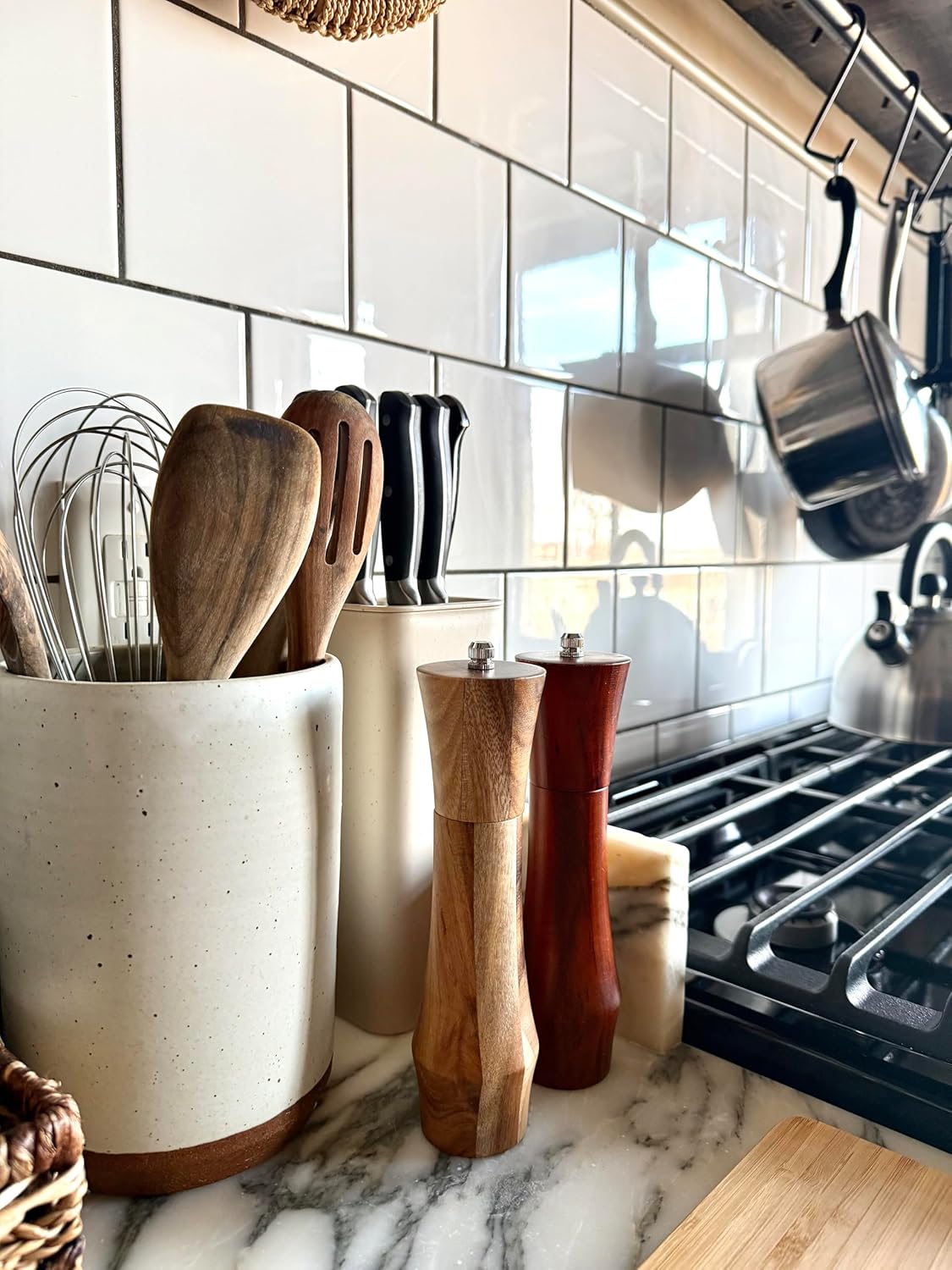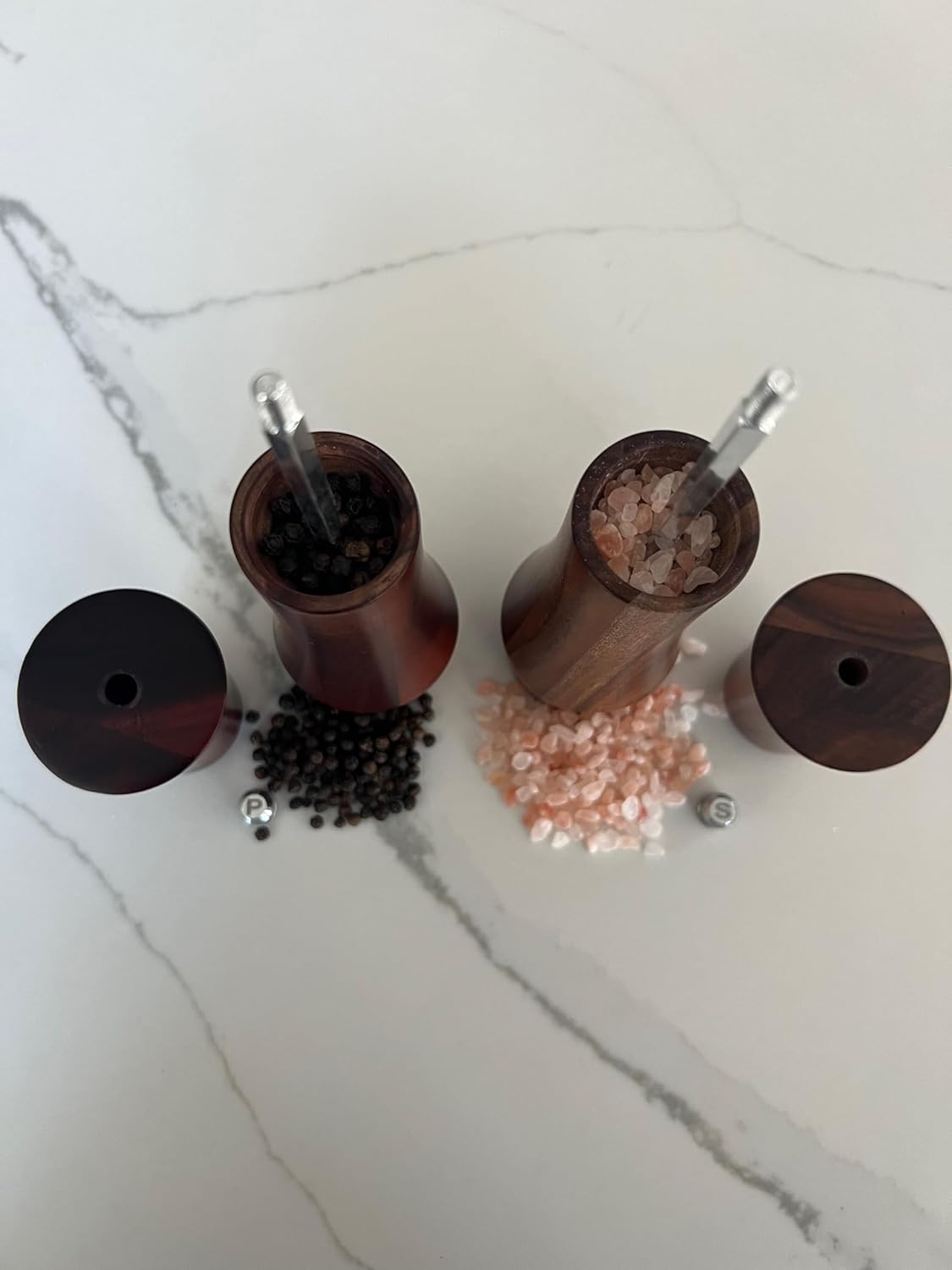Bring timeless beauty and elevated flavor to your kitchen with this handcrafted 8-inch Acacia Wood Salt and Pepper Grinder Set. Expertly crafted from high-quality acacia wood, each grinder showcases unique natural grain patterns and warm, earthy tones—making it as much a statement piece as a functional kitchen essential. Whether displayed on your countertop or your dining table, these wooden mills add rustic charm and refined style to any setting. The ergonomic silhouette fits comfortably in your hand, allowing for smooth, effortless grinding, while the premium ceramic grinding mechanism delivers consistent performance—perfect for unlocking the bold flavors of fresh peppercorns and coarse salt. Ideal for everyday use or as a thoughtful gift for home chefs, foodies, or anyone who appreciates quality craftsmanship. Upgrade your kitchen tools with a grinder set that blends functionality, durability, and natural elegance.