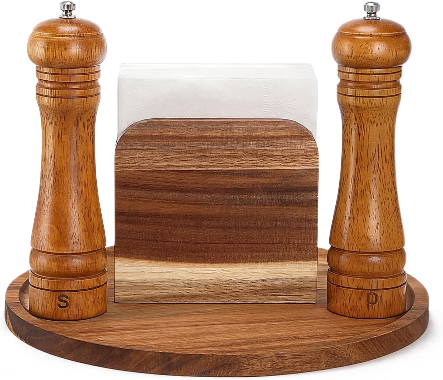 Features: This acacia wood round tray and napkin holder are not only practical but also beautiful, exuding rustic charm. They are suitable for both farmhouse style kitchen decor and centerpieces on the dining table, adding elegance to your table. Whether you need finely ground pepper or coarsely ground peppercorns, this grinder can meet your needs. Specifications: Material: Acacia Wood Color: Acacia Size: The round wood tray is about 12 inches The wood salt and pepper grinder is about 8 x 2.2 inches The wood napkin holder is about 5.47 x 5.08 x 2.68 inches Package includes: 1 X Round wood tray 2 X Wooden Grinder 1 X Wood napkin holder Notes: Manual measurement, please allow slight errors on size. The color may exist a slight difference due to different screen displays