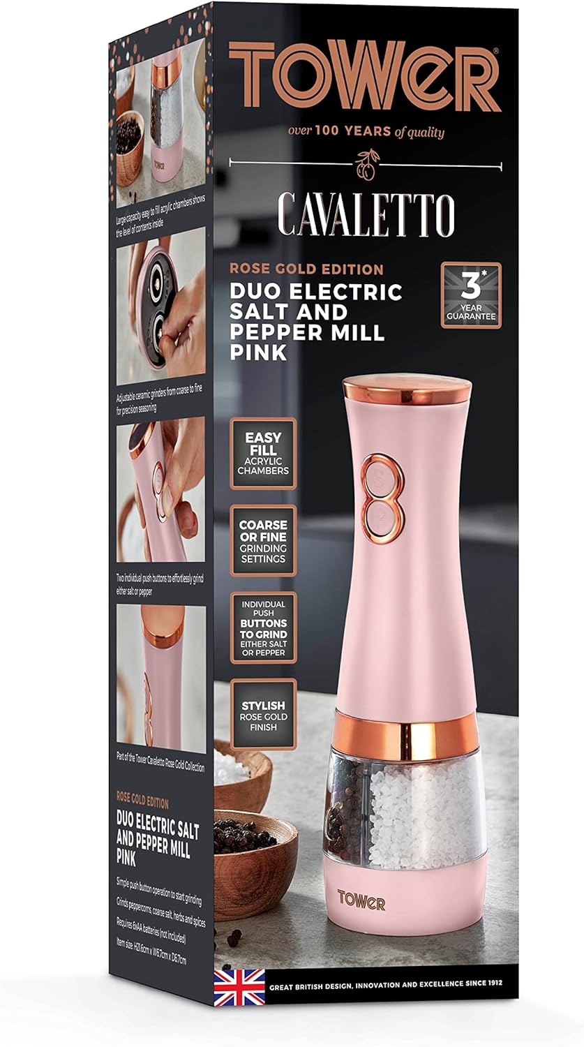 Tower’s Electronic Duo Salt and Pepper Mill in Pink and Rose Gold are a must-have essential for your dinner table. The elegantly designed duo mill includes a battery-operated mechanism that adds a touch of class to any evening meal. Featuring an adjustable grinder function, you can choose whether to have fine or coarse salt and pepper seasoning suited to your taste. The clear acrylic chambers in the main body offer viewing windows so you can keep an eye on the level of the contents for a top up and for added convenience. You only need to press a button for the mill to operate for effortless usage.