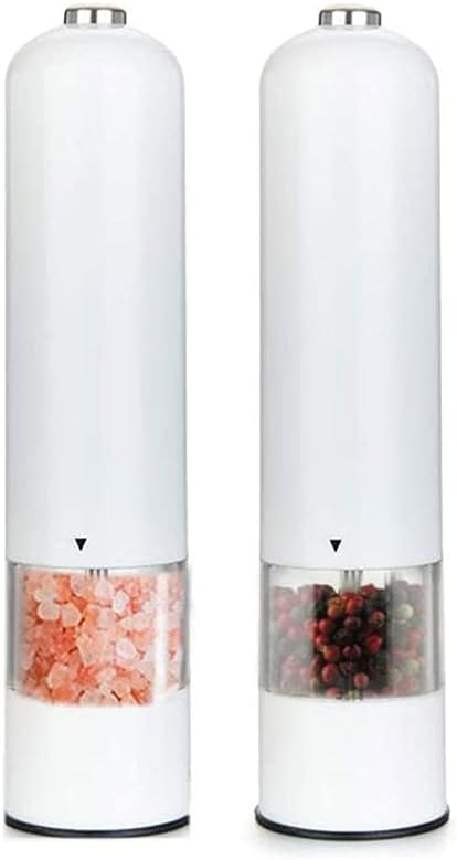 Colour:Black/White Our pepper grinder is designed to make easier life of our users. Features *Clear glass body to quickly check if a refill is needed *Can adjust from coarse to a fine grind easily *You can grind the pepper and salt into your desired thickness by pressing only one button. Length: 220mm Diameter: 50mm Power: 4* AA batteries (not included) Package include: 2 * Salt & Pepper Mills Note: 1. The color of the product may differ from the image due to light or shooting angle. 2. Product size is measured by hand, there may be errors, thank you for your understanding. 3.Always keep clean and avoid contacting with water 4.Salt and pepper grinders do not include any fragrance, batteries are not included