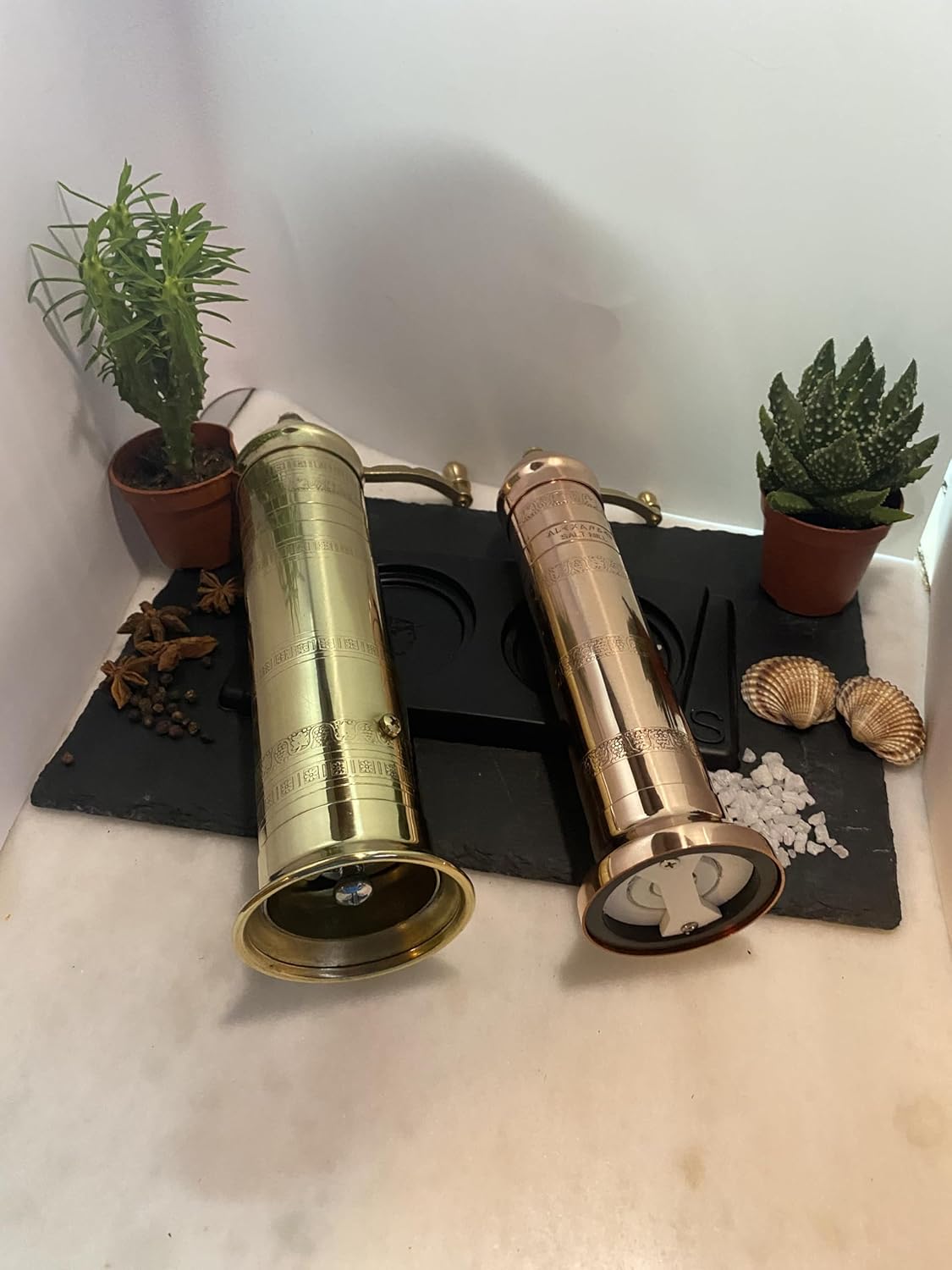 Brass Pepper Mill ALEXANDER #105 The ALEXANDER #105 Brass Pepper Mill features a 100% metal mechanism with a 38mm diameter and a 3DCut system designed to truly grind peppercorns, enhancing their flavor and aroma. Unlike common pepper mills that merely smash the peppercorns, this mill maximizes flavor release. The adjustable mechanism allows for fine to coarse grinding to match your recipe needs. Each mill offers ample space for your favorite dry seasonings and lets you grind directly over your food. ALEXANDER #409 9’’ Copper Salt Mill, featuring a robust food-safe plastic mechanism (40% glass) with a 38mm diameter and a corrosion-resistant stainless steel shaft. Equipped with a 3DCut system, this mill is designed to finely grind salt, maximizing its flavor and aroma, unlike conventional salt mills that simply crush it. Each mill offers ample space for your preferred type of salt and allows for convenient grinding directly over food. The 3DCut grinding system operates in three precise steps: cracking the salt, cutting it into smaller pieces, and swiftly and efficiently grinding it to perfection. Handcrafted in Greece to meet stringent standards of quality and functionality, Alexander Mills have been a staple since 1977, consistently praised for their performance and durability. With its durable polished copper body, long arm for easy grinding, and stable flanged base, this mill is a special addition to any kitchen.