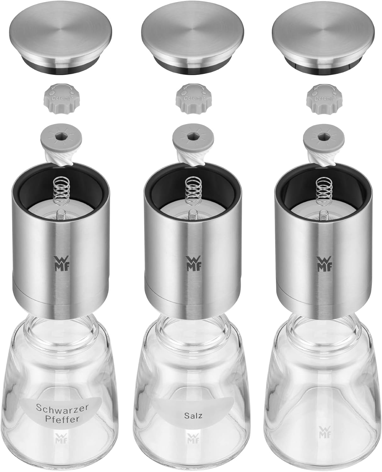 WMF 14 cm De Luxe Spice Mill Set is designed by Metz and Kindler. With the "De Luxe" range, your guests can add extra seasoning to their hearts' desire. The stylish Ceramill De Luxe grinders are eye-catchers on any dining table. To accompany the grinders, the range includes condiment sets, stands and vinegar/oil dispensers.