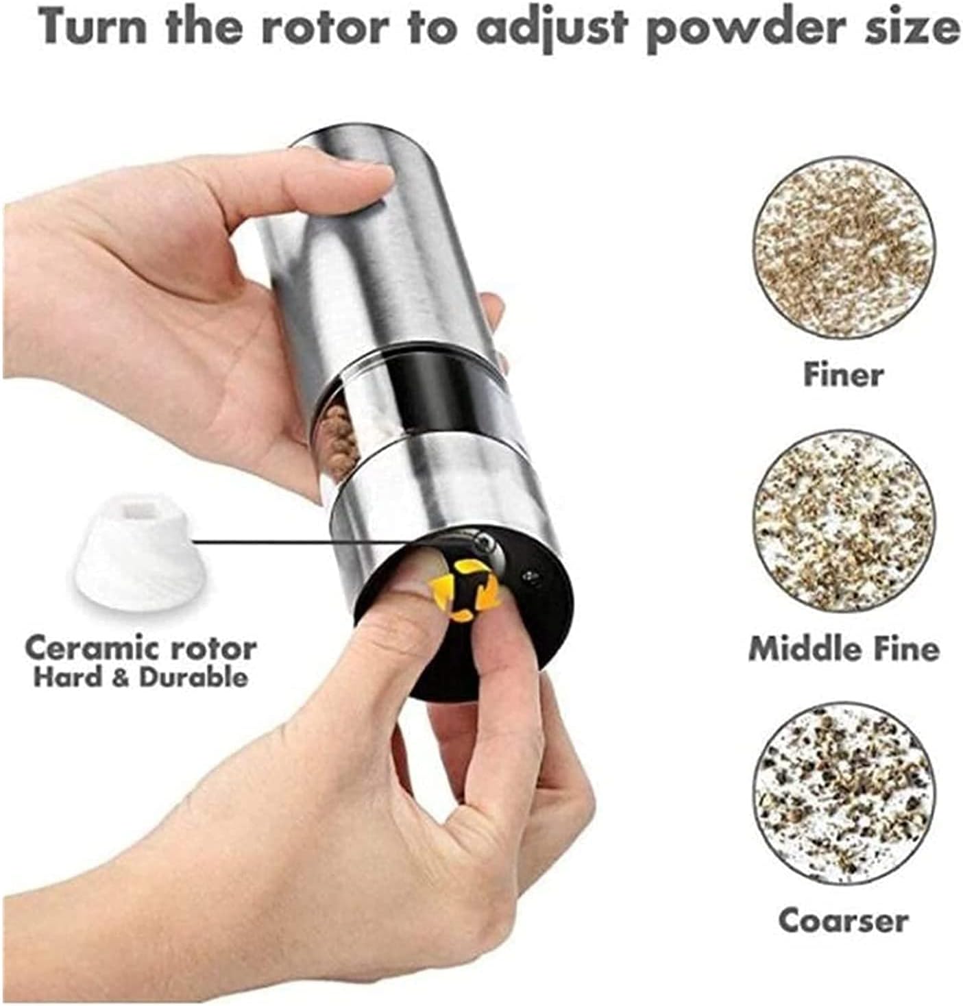 Salt mill and pepper mill can adjust the coarseness and coarseness of ingredients according to needs.The perfect complement to dinner: Anyone who is passionate about cooking and food can prove that presentation is just as important as the food itself. Using salt and pepper grinders can add sophistication, convenience and versatility to any banquet or banquet.The spice container made of high-quality stainless steel is durable and the perfect salt and pepper grinder!Name: Electric Pepper Mill core: ceramic coreSize: 54*228mmSeveral major features of the product:1. Electricity is convenient and simple2. Large capacity3. Ceramic grinding core, high hardness, healthy and environmentally friendly, easy to cleanPackage include:2* Salt & Pepper MillsTips:The subtle difference between the picture and the actual object is caused by the brightness of the light. Thank you for your understanding.※ Your arrival is my honor, thank you for your trust and support, If you have any questions, feel free to contact us and we will provide you with the best service.