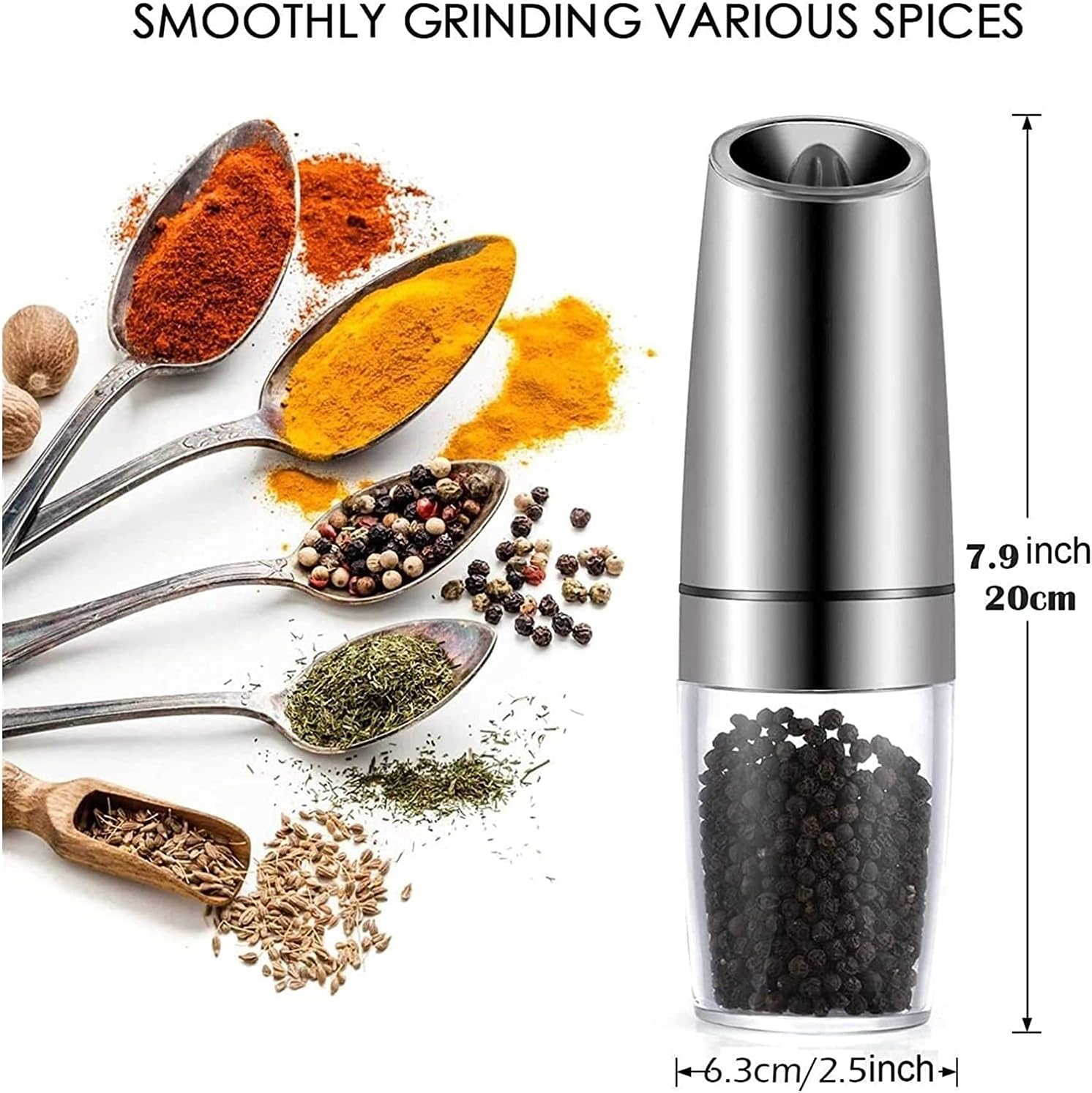 Ergonomic handle design, comfortable handle, easy to use.is the household kitchen l product.Selected stainless steel shell, environmental protection and pollution-free, is a very practical kitchen helper in life. Easy to use, beautiful appearance, to add more fashion classic atmosphere to life.Salt mill and pepper mill can adjust the coarseness and coarseness of ingredients according to needs.The perfect complement to dinner: Anyone who is passionate about cooking and food can prove that presentation is just as important as the food itself. Using salt and pepper grinders can add sophistication, convenience and versatility to any banquet or banquet.SUITABLE FOR ALL KINDS OF SPICES: a professional ceramic grinder allows you to transform almost all possible spices into the right particle size: from sea salt, high-quality crystal salt, pepper to peculiar chili, everything is possible!Specification:Material: Stainless steel , ABS, acrylic, ceramic grinding coreColor: BlackSize: 6.3x20cm/2.5x7.9InchPackage List: Grinder x 2(Note: Salt and pepper not included)Features:1. Fully Equipped And Built To LastStainless Steel body with a sturdy transparent acrylic storage room. Top quality Ceramic Rotor offers long time durability and can grind against the toughest peppercorns, Himalayan salt, sea salt or other spices.2. No over flavoringThe botof the grinder bright light illuminates the food to provide greater clearly and help you prevent over flavoring of the dish;3. Battery operatedEach grinder requires 6 AAA batteries ( NOT Included)4. start, one-hand grindingJust simply turn upside down and get fresh ground salt or pepper. Allows you to activate the spices you like with one hand, while the other hand is free to handle other kitchen tasks.5. A powerful motor can grind any spice you want. You can taste the fresh spices at home.6. Adjustable Coarsene