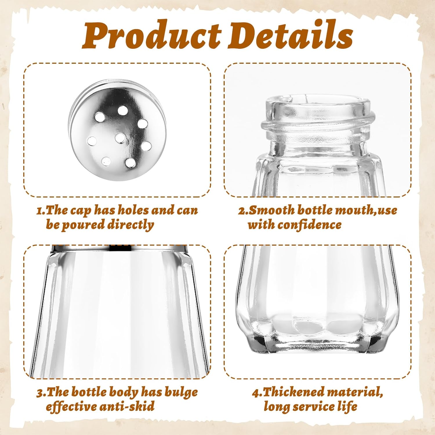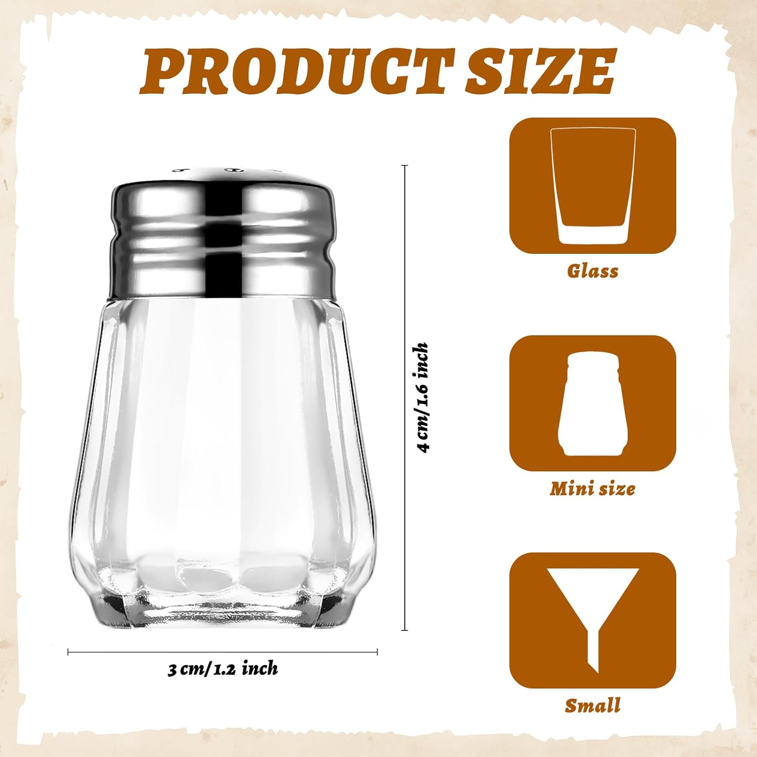 Features: Glass shaker can hold seasonings. When you need to replenish, simply unscrew the stainless steel top, pour in the seasoning you want, and then firmly screw it back to make your seasoning ready to use at any time. The seasoning shakers with lids are made of reliable glass with stainless steel, can be applied for various occasions, such as restaurant, church dinner, parties, weddings, dining cars, kitchens, bars and so forth. Specifications: Material: glass, stainless steel Color: clear Size: approx. 1.2 x 1.6 inches/ 3 x 4 cm Capacity: 0.5 oz Package includes: 150 x Pepper shakers Notes: Manual measurement, please allow slight errors on size. The color may exist a slight difference due to different screen displays. The seasoning shakers with lids are fragile, so handle with care to avoid any breakage.