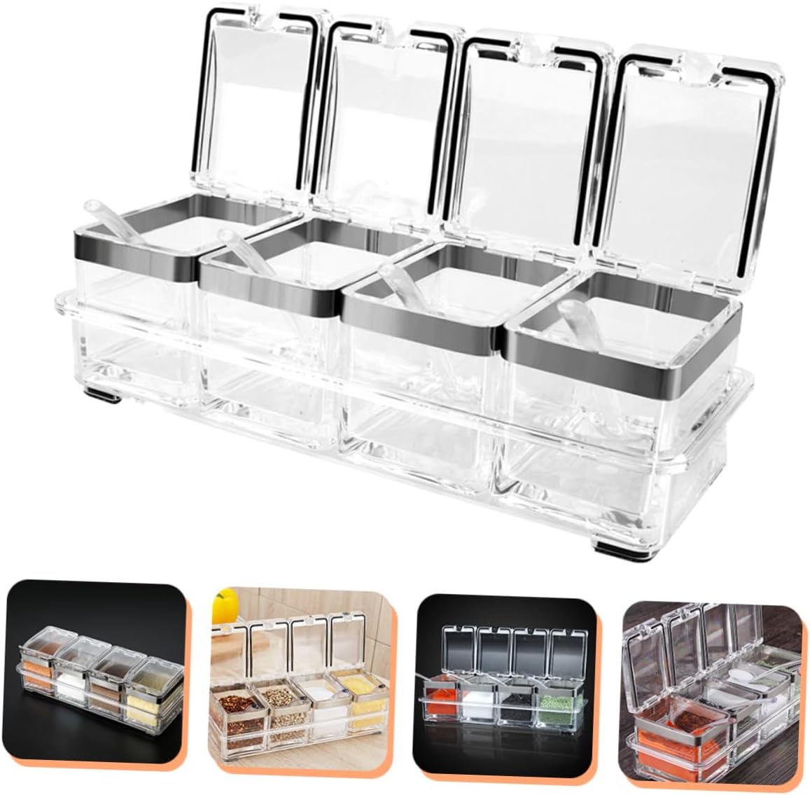Package Include 4 x Seasoning Boxes 4 x Spoons 1 x Organizing Tray Characteristics -Color: Transparent -Material: Acrylic, stainless steel - Size: 25.00X9.50X6.20cm/9.82X3.73X2.44in - It has a simple design, but very practical in use, giving you a - Enough for you to store different spices and separate design can prevent them tainted by each other's odor - Clear transparent container allow you to view the contents clearly. Conveniently to recognize the spice needed - Can be used for sugar, salt, spices, pepper, seasoning, liquid sauce, powder, etc, make your cooking more easyGoods InformationThis seasoning box set combines transparent acrylic with stainless steel elements to provide and easy-to- storage for variety of condiments such as salt, sugar, pepper, and spices. Its clear design allows for quick visual identification, reducing kitchen prep time. Featuring separate compartments with lids and included tray, it helps maintain distinct flavors and keeps your kitchen pantry organized. Sized at 25.00X9.50X6.20cm, it fits comfortably on countertops or cabinets. The simple yet stylish look adds a neat, functional touch to your cooking space, making meal preparation more efficient and enjoyable for daily use From SHOWERORO was founded to bring practical elegance to everyday kitchens through thoughtful design and quality materials. Our acrylic seasoning box set embodies this by helping home cooks organize spices while adding a touch of style. Experience the joy of smooth cooking and enhanced kitchen aesthetics with SHOWERORO—where function meets beauty