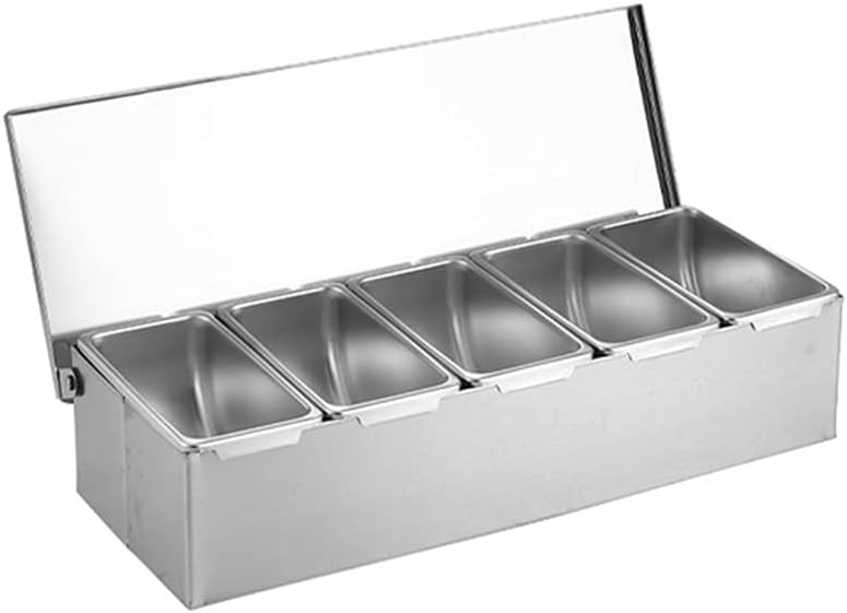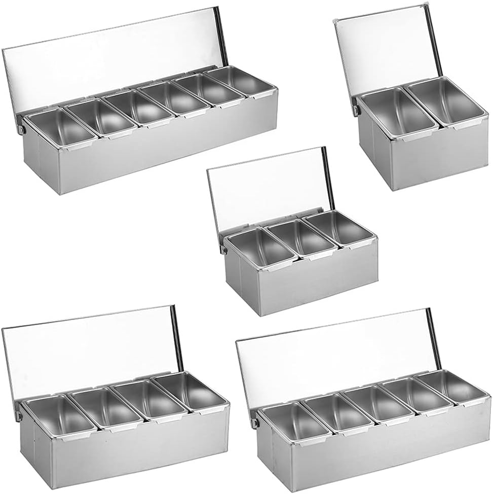 Seasoning Containers Set Stainless Steel Seasoning Box Jar Rack Condiment Cruet Bottle Square With Features It has many uses and can be used to contain various seasonings, snacks, flour, dry goods, These boxes adopt a split large-capacity design, efficient storage, and a tidy kitchen.You can these seasoning boxes according to your needs, easy to disassemble and easy to carry.These boxes are designed with a which is and The thickened steel is and will not rust, and the curled edges will not hurt your hands.Specifications:Stainless steelColour: SilverSize:Approx. 15x15x9 for cm/5.91x3.54x2.76 inches(double compartment) Approx. 23.5x15x9 for cm/9.25x3.54x2.76 inches(three compartments) Approx. 30.8x15x9 for cm/12.13x3.54x2.76 inches(four compartments) Approx. 38.5x15x9 for cm/15.16x3.54x2.76 inches(five compartments) Approx. 46x15x9 for cm/18.11x3.54x2.76 inches(six compartments)Package Includes:1 set seasoning boxNote:1.Please allow 0-2cm errors due to manual measurement, make sure that you do not mind before you order. 2.Due to the difference between different monitors, the picture may not reflect the actual color of the item.3.Other parts are not included