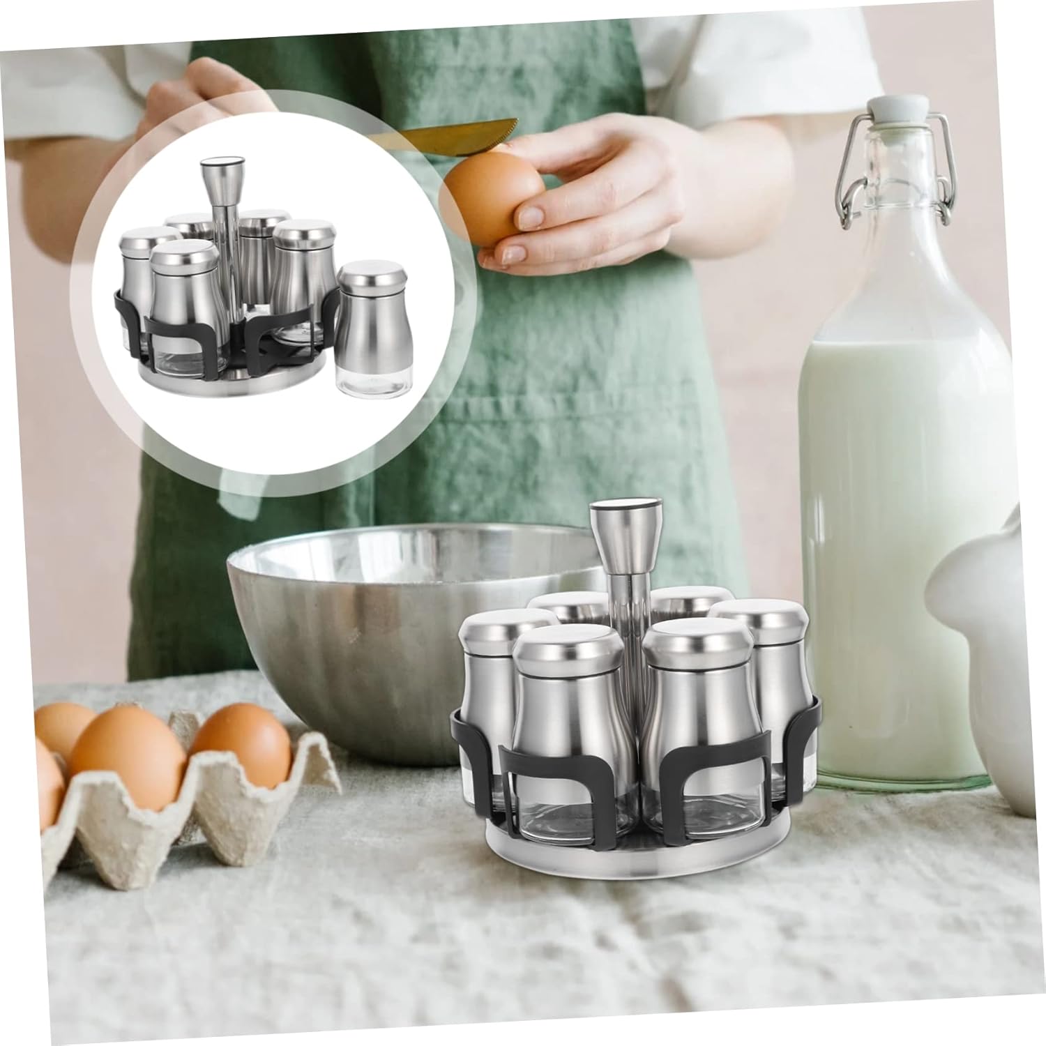 Package List 6 x seasoning jars 1 x organizer rack Features -Color: As shown Pepper Bottle -Size: 19.00X18.00X17.00cm/7.47X7.07X6.68in Stainless Steel Seasoning Jar. -Material: Stainless steel, glass, PP Kitchen Jar - It can be used to hold a variety of condiments: pepper, sugar, salt, chicken broth powder, oil, honey and more Seasoning Jar. - The stylish shaker is for all those who love organizing. With its help you organize the spices and store them in a safe place where the products can keep their taste and freshness Salt Shaker. - This storage bottle is easy to clean. kitchen condiment storage helper Pepper Container. - Suitably sized and easy to hold and sprinkle the exact amount of seasoning you want in your food Salt Sugar Shaker. - Makes cooking easy and adds of taste to your dishes with the assortment of spices it can hold Spice Jar.Goods InformationSpice Bottle The shaker is suitable for homes, restaurants, pantry, etc.Kitchen Jar It comes with a smart design that makes it easy to hold and dispense the right amount of seasoning that you want.Salt Sugar Shaker This seasoning shaker with multiple holes for dispensing salt, pepper, and other condiments to make your food taste better