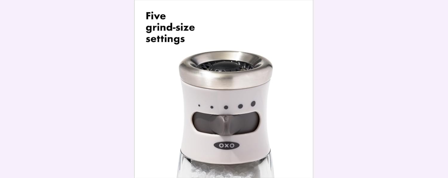 The sleek and stylish OXO Good Grips Contoured Mess-Free Salt Grinder is an ideal addition to any kitchen or dining table. This manual Grinder has stainless steel accents plus a clear acrylic body, so you'll know when it's time to refill. Slide the tab to choose one of five levels of grind, from fine to coarse. An airtight lid keeps salt fresh and dry while the non-slip grip allows for easy, comfortable use. Grind and serve from the top for mess-free storage. Comes pre-filled with coarse salt. Hand-wash only.