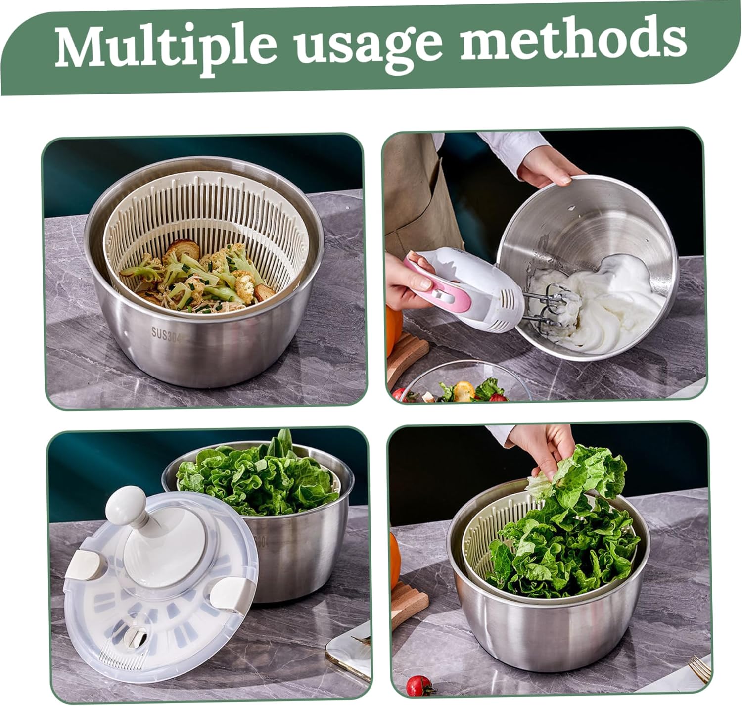 Description: The 5L Salad Spinner is an essential kitchen tool designed to quickly and efficiently dry your fruits and vegetables. Featuring dual-layer design with stainless steel and PP materials, this salad spinner provides superior durability and long-lasting performance. The easy-to-use rotating handle allows for effortless spinning, quickly removing excess water from your greens, ensuring that your salads remain crisp and fresh. Its spacious 5L capacity is ideal for rinsing and drying large portions of lettuce, spinach, and other vegetables, as well as fruits. Whether you're preparing light meal or large salad, this spinner offers versatility for everyday use. Its sleek and compact design makes it perfect fit for any kitchen, taking up minimal space while offering maximum functionality. Ideal for quick meal prep, the Salad Spinner is must-have tool for anyone looking to prepare fresh, healthy meals in breeze. Features:. Salad Spinner. -Color: Silver. -Material: Stainless Steel, PP. -Size: about 24.5x22cm/9.65x8.66inch. -Capacity: 5L. Note:Manual measurement, please allow slight errors on size.The colors may exist slight difference due to different screens. Package Including 1 x Salad Spinner.