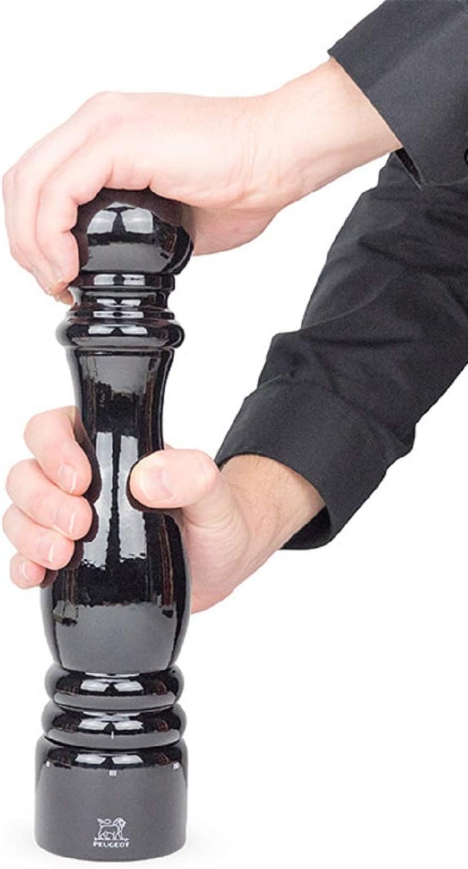 Product Description Peugeot Paris U'Select 10-3/4-Inch Pepper Mill, Black Lacquer Amazon.com Exceptionally well-crafted, the Paris pepper and salt mills from Peugeot are traditionally styled of turned beechwood. This particular model offers the U-Select feature, which designates six settings on the base of the mill for precision grinding ranging from extra-coarse to powdery. The difference between the salt and pepper mills lies in the grinding mechanism. Peugeot pepper mills use case-hardened-steel grinding heads with two sizes of grooves; the larger grooves crack the peppercorns in half and direct them into the smaller grooves, which grind them much more finely than most mills. The grinding mechanism in Peugeot salt mills is purposefully constructed with 18/10 stainless-steel, which won't corrode from prolonged contact with the salt. The top of each mill unscrews for adding peppercorns and salt, while the round ball nut can be loosened or tightened to vary the coarseness of the grind. Paris pepper and salt mills are sold individually and in sets. The mills come in a wide range of heights, from about 5 to nearly 20 inches, and in a variety of finishes, including matte chocolate, natural wood, and shiny blue, yellow, or red lacquer. Care for the mills is easy: clean the exterior and inner chamber with a damp cloth; never immerse in water; avoid putting salt in the pepper mill, or grinding green or pink peppercorns by themselves (mixed with black is fine); and avoid damp types of salt (usually pink or gray) in the regular salt mill. Made in France, Peugeot mills are covered by a two-year replacement policy, while the grinding mechanism is covered by a lifetime warranty. Peugeot has been a leading manufacturer of pepper mills since the 1840s, and is a brand preferred by many fine restaurants and chefs. --Ann Bieri