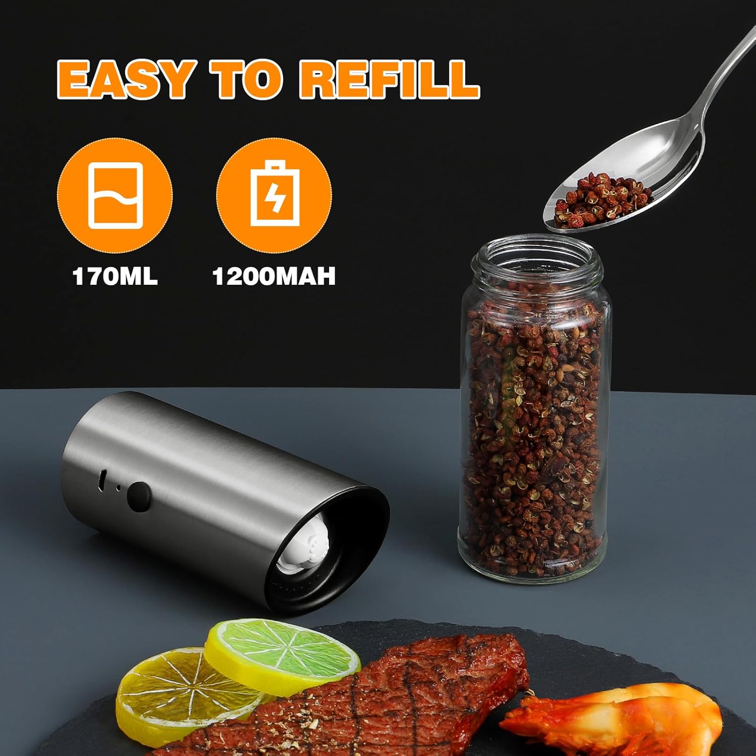 Package Include 1 x Electric Pepper Mill 1 x Power Cable Characteristics - Material: Stainless steel, ABS. - Seasoning capacity: 170ML pepper and salt grinder. -Product Info:Electric pepper mill - Size: 22.50X5.20X5.20cm/8.84X2.04X2.04in. - Battery capacity: 1200MAH pepper grinders. - ColorAssorted Color - One hand operation, just press the power button to start or stop working, suitable for various spices such as salt, pepper and other solid seasonings pepper millpepper mill grinder. - You can easily adjust the coarseness of pepper or salt particles by turning the adjustment knob on the , to meet your different requirements power pepper grinder. - With built- sensor, just flipping to get the ground pepper or salt. Detachable grinding head, easy cleaning, can prevent odor or residue refillable salt pepper grinder. - Our pepper mill is made of stainless steel, glass and ABS material, non-corrosive, , making the spices more fresh and healthy, large capacity, easy to refill and clean. - Use our pepper to make your home cooking and dining experience more enjoyable! Easy to charge with the equipped power cable, a good choice for parents and friends pepper grinder.Goods Descriptionseasoning grinder Portable and convenient, use it anywhere you like.pepper and salt grinder Battery powered electric design, save your time and energy.kitchen mill grinder You can turn the adjustment knob on the to adjust the coarseness of the ground particles.small pepper grinder Use our mill to grind pepper, salt and other solid grain seasonings for cooking use