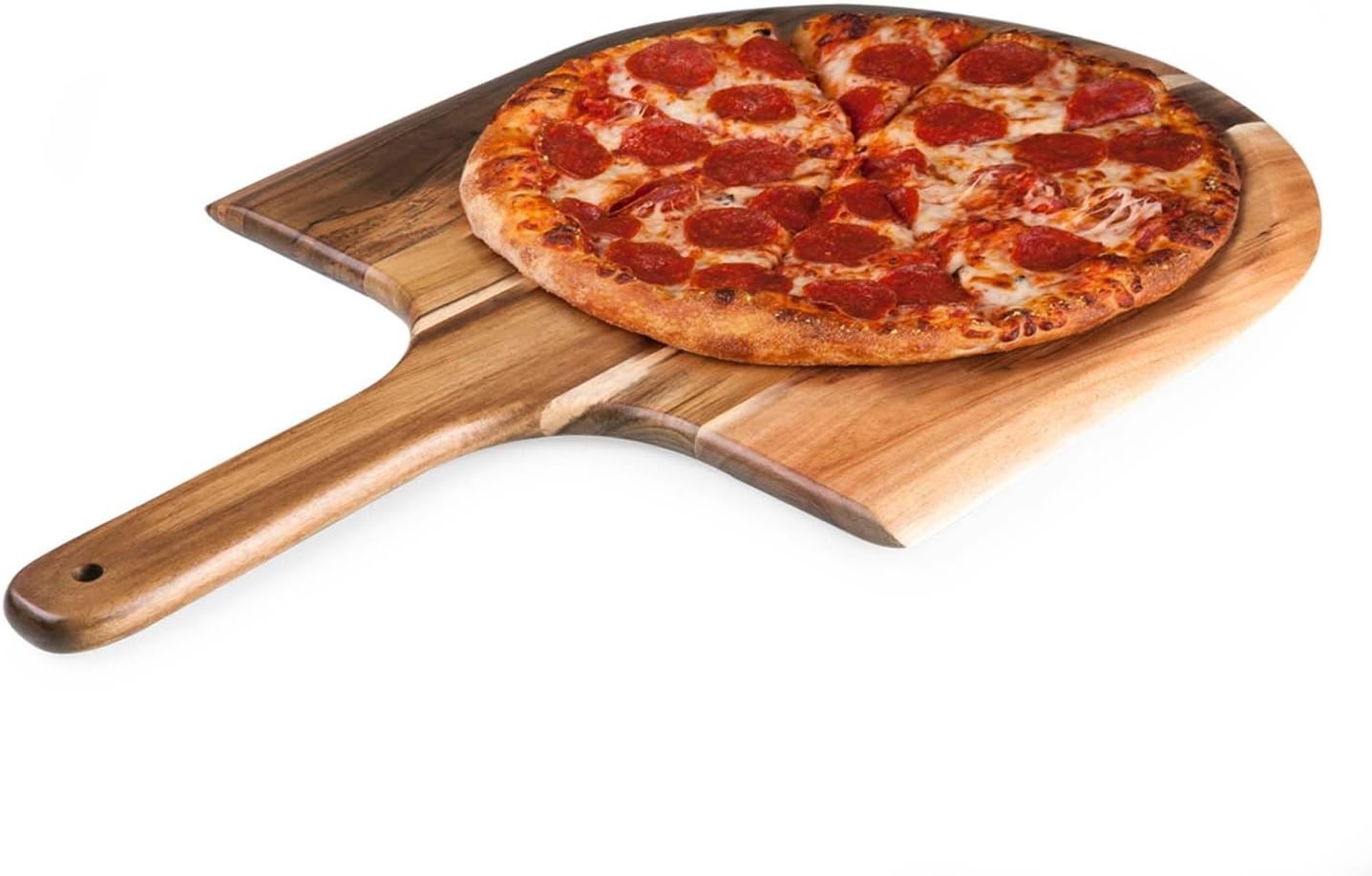 Meet the pizza peel that does more than just move pizza—it makes pizza night feel legendary. Crafted from rich acacia wood, this pizza peel blends pro-level performance with natural style, giving you a tool that looks as good on the table as it feels in your hands. The flat paddle design and beveled edge work together to slide smoothly under pizza, bread, or flatbreads, helping you lift, launch, and serve with confidence. Whether you’re pulling a bubbling pie from the oven, transferring dough onto a pizza stone, or slicing and serving straight from the board, this wooden pizza peel handles the job with ease. Sized at 22.3 by 13.8 inches, it’s built to comfortably support pizzas up to 14 inches, making it ideal for home ovens, grills, or pizza stones. The tapered handle offers a steady, comfortable grip, giving you better control when working around heat and helping every transfer feel smooth and secure. Beyond pizza, this versatile board shines as a bread peel, serving board, or rustic presentation plank. Use it to serve fresh bread, appetizers, or sliced pizza straight from the oven to the table. When not in use, the integrated hanging hole lets you store it on display, turning a functional kitchen tool into a warm, natural accent. Acacia wood is known for its durability and striking grain, giving each piece a unique look that elevates everyday cooking. Easy surface cleaning keeps it ready for repeat use, so you can focus less on cleanup and more on enjoying every slice. From prep to presentation, this pizza peel proves that great pizza deserves a great paddle—one that’s reliable, stylish, and always ready for the next craving.