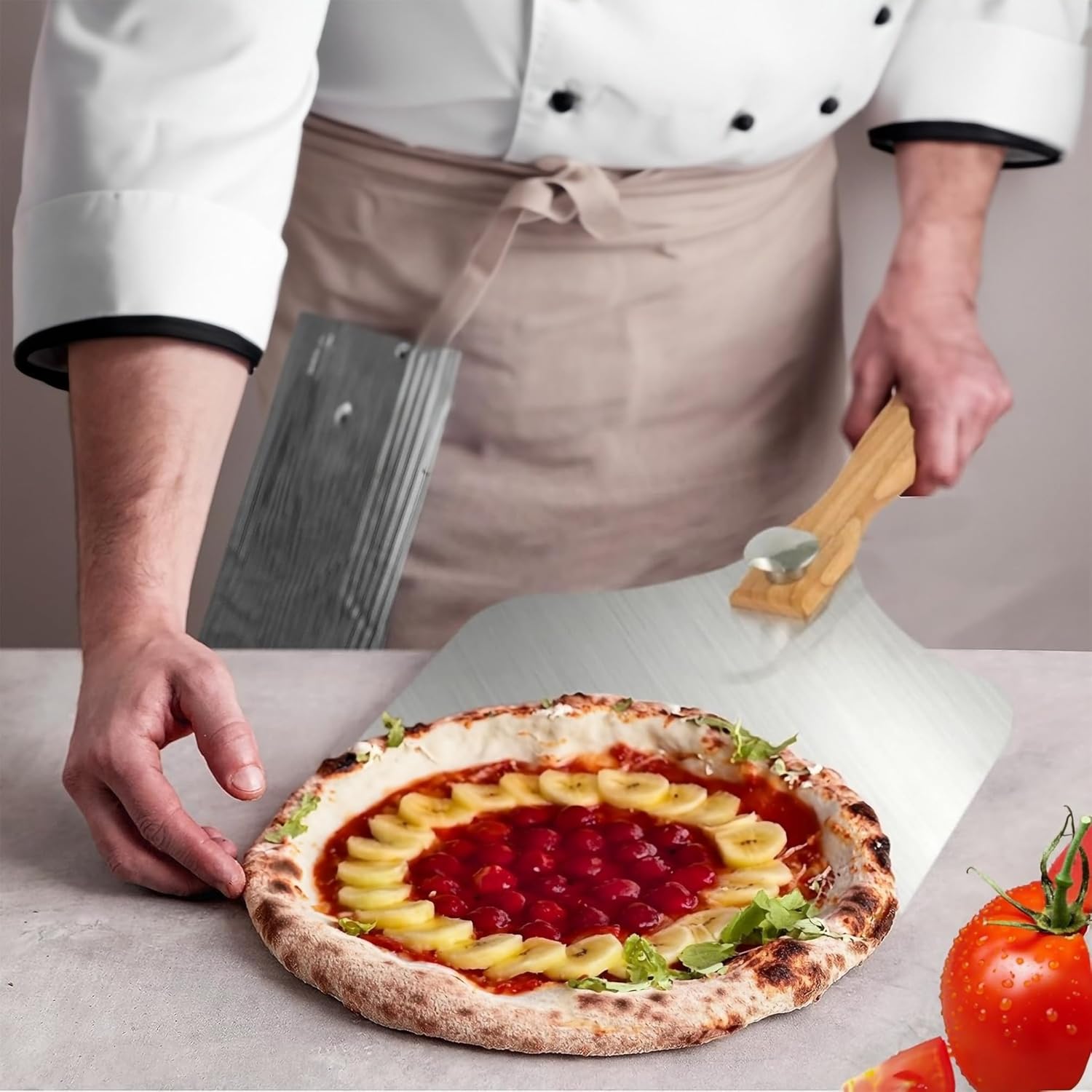 - 14" Square X 25" Long Aluminum Pizza Peel: Made from 1.5mm thick Oxidation aluminum, the peel measures 12" x 12", extends to 25" in length, and the 12" rubber wooden handle provides a comfortable grip. It weighs 1.19 pounds. - User-Friendly: Features a detachable shovel head and handle for easy cleaning, a foldable design for space efficiency, and a hanging hook for convenient storage. - Material and Design: Constructed with a durable aluminum surface, and rust-resistant 304 stainless steel screws. - Design Craftsmanship: The angled grip ensures comfort during use, and the stainless steel surface features a brushed texture. - Usage Notices: Comes with a protective blue film to prevent scratches during transit. This film should be removed before using the pizza peel. - Product Video: Instructions can be found via the video link provided, or by searching "21912 Pizza Paddle Cutting Board FixtureDisplays" on YouTube. The video is also available for download through the provided link.