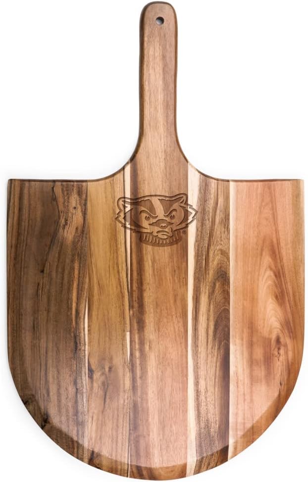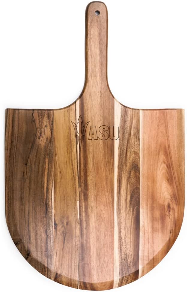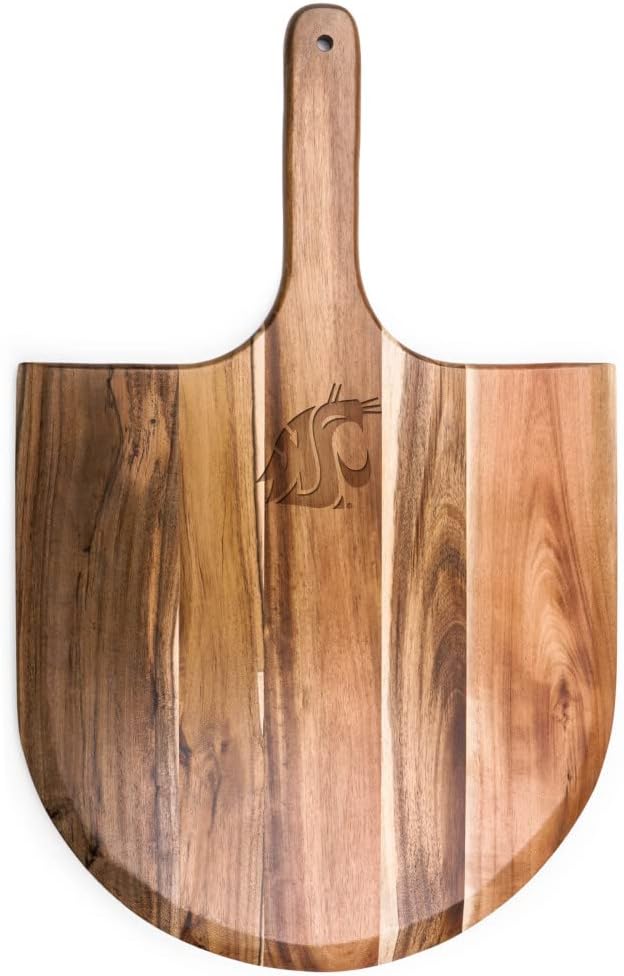 This Picnic Time NCAA pizza peel is made of gorgeous acacia wood, and is designed for transferring pizzas from the oven to the counter top for slicing. This pizza peel features a flat paddle design with beveled edges for getting under the pizza in the hot oven, and comes with your favorite team's laser engraved logo. The tapered handle offers comfort in the hand and a steady grip, while a hole at the end allows for hanging on the wall or in the pantry. The pizza peel by Picnic Time may also be used for transferring breads or pastries from a hot oven. Surface wash board with a damp cloth only. To prevent wood from warping and cracking, do not submerge in water. Manufacturer recommends occasionally rubbing with food-safe mineral oil to prevent wood from drying out or cracking. Measures 22.3 by 13.8 by.5 inches.